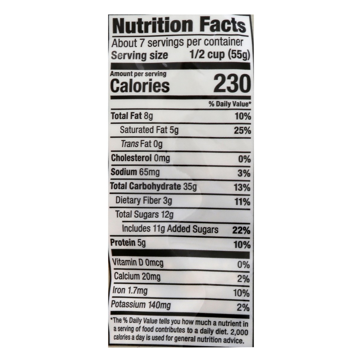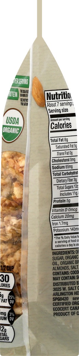 With almonds and whole grain oat clusters. Naturally flavored. Per 1/2 Cup: 230 calories; 5 g sat fat (25% DV); 65 mg sodium (3% DV); 12 g total sugars. USDA Organic. Certified Organic by: Ecocert Can…