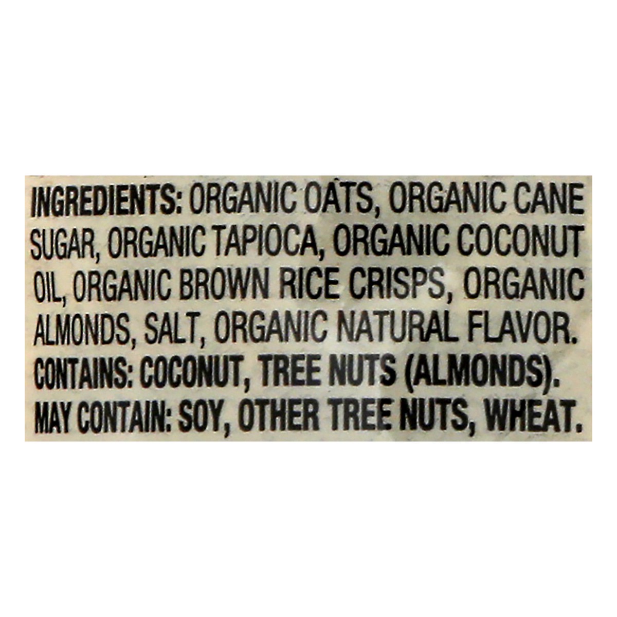 Organic Oats, Organic Cane Sugar, Organic Tapioca, Organic Coconut Oil, Organic Brown Rice Crisps, Organic Almonds, Salt, Organic Natural Flavor.
