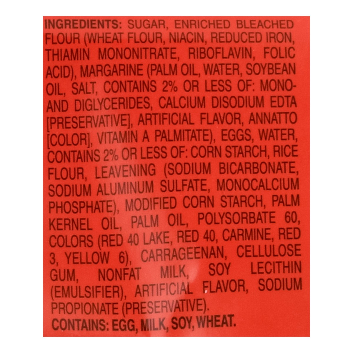 Sugar, Enriched Bleached Flour (Wheat Flour, Niacin, Reduced Iron, Thiamin Mononitrate, Riboflavin, Folic Acid), Margarine (Palm Oil, Water, Soybean Oil, Salt, Contains 2% or Less of: Mono- and Diglyc…