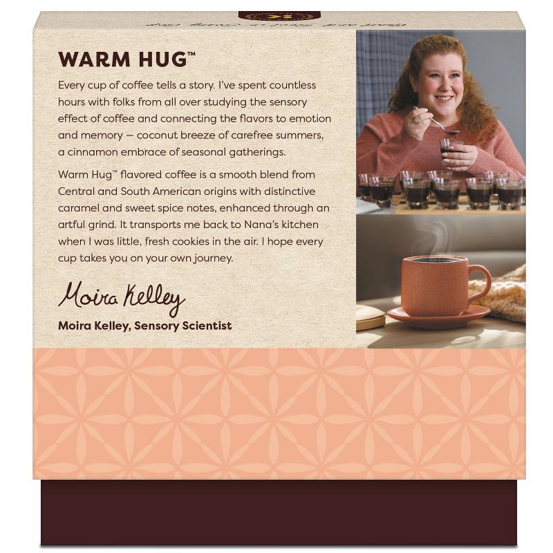- TRAILBLAZER QUOTE: "Warm Hug flavored coffee is a smooth blend from Central and South American origins with distinctive caramel and sweet spice notes, enhanced through an artful grind. It transports me back to Nana's kitchen when I was little, fresh cookies in the air.” - Moira Kelley, Sensory Scientist