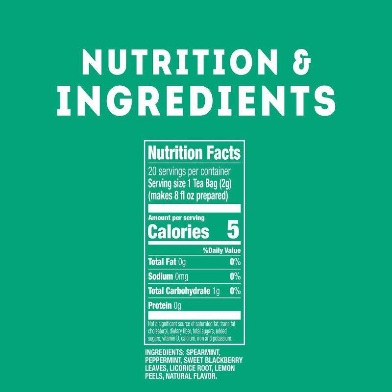 SPEARMINT, PEPPERMINT, SWEET BLACKBERRY LEAVES, LICORICE ROOT, LEMON PEELS, NATURAL FLAVOR.