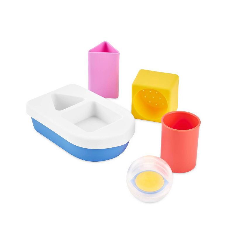 - 6-piece set includes: 3 shapes to sort, “bubble” ball spinner & 2-piece boat.