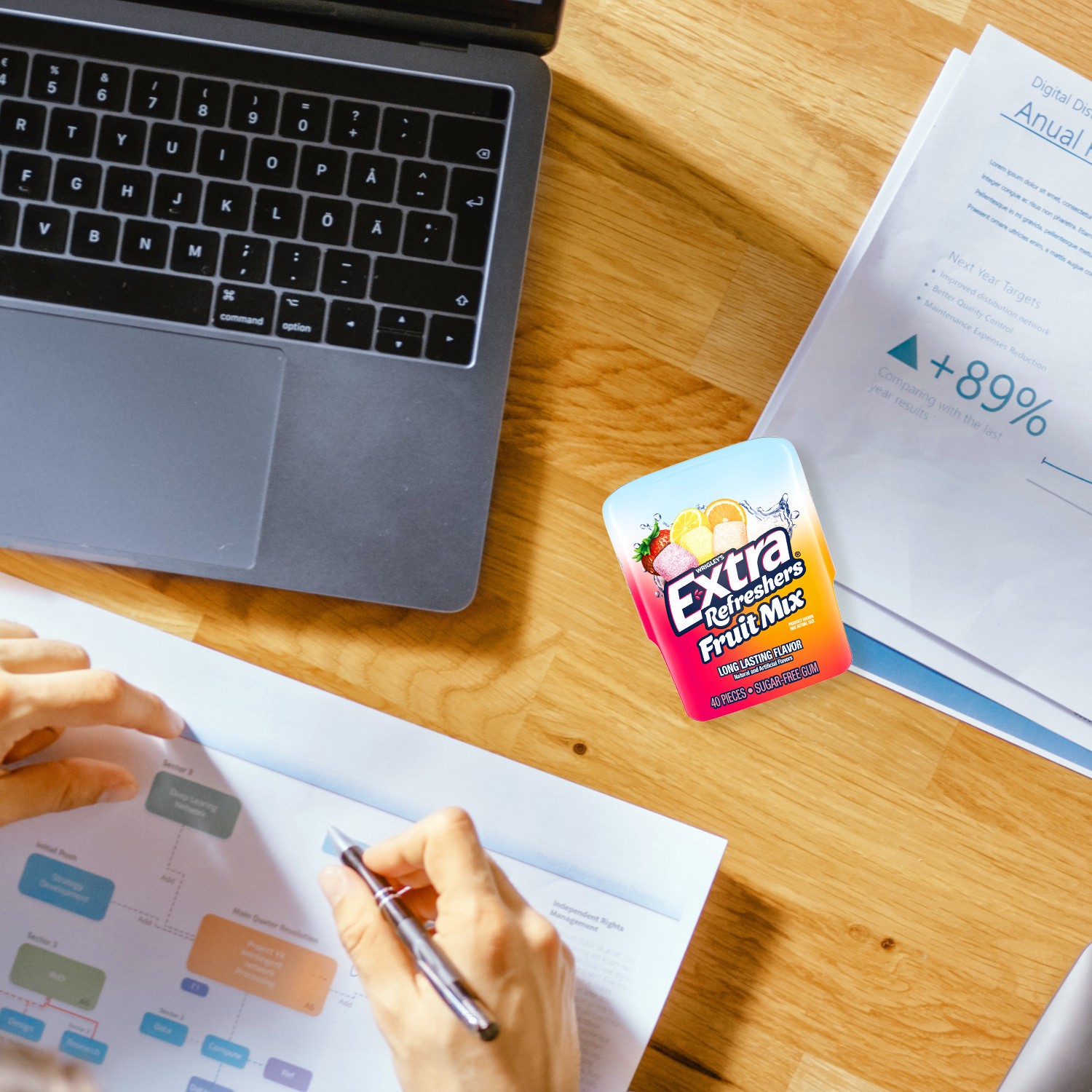 NEW EXTRA Refreshers Fruit Mix Sugar Free Chewing Gum gives you long lasting fruity flavor for any occasion. This NEW flavor experience combines 3 fan favorite flavors into one convenient resealable b…