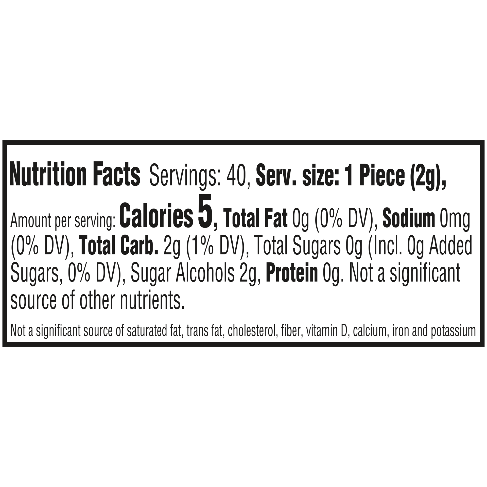 XYLITOL, GUM BASE, NATURAL AND ARTIFICIAL FLAVORS; LESS THAN 2% OF: ACACIA, CITRIC ACID, SOY LECITHIN, ASPARTAME, SORBITOL, MALIC ACID, ACESULFAME K, SUCRALOSE, COLORING (INCLUDES YELLOW 5 LAKE, RED 4…