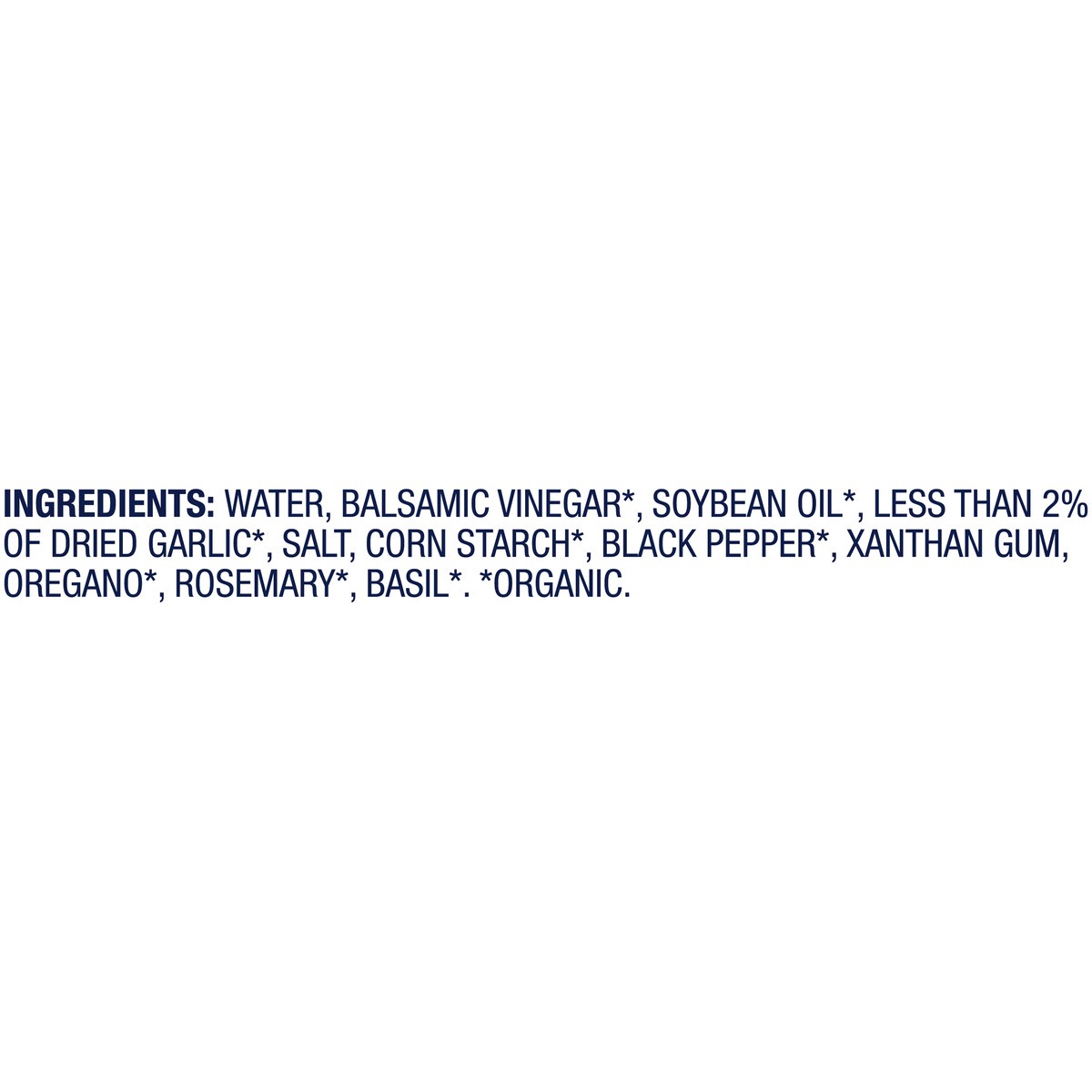Water, Balsamic Vinegar (Organic), Soybean Oil (Organic), Less than 2% of Dried Garlic (Organic), Salt, Corn Starch (Organic), Black Pepper (Organic), Xanthan Gum, Oregano (Organic), Rosemary (Organic…