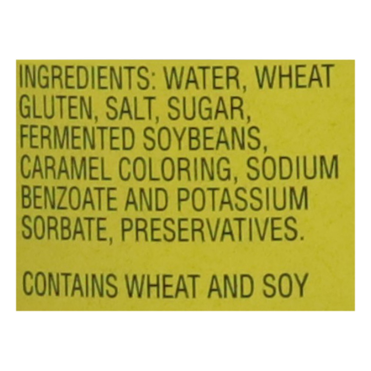 Water, Wheat Gluten, Salt, Sugar, Fermented Soybeans, Caramel Coloring, Sodium Benzoate and Potassium Sorbate, Preservatives.