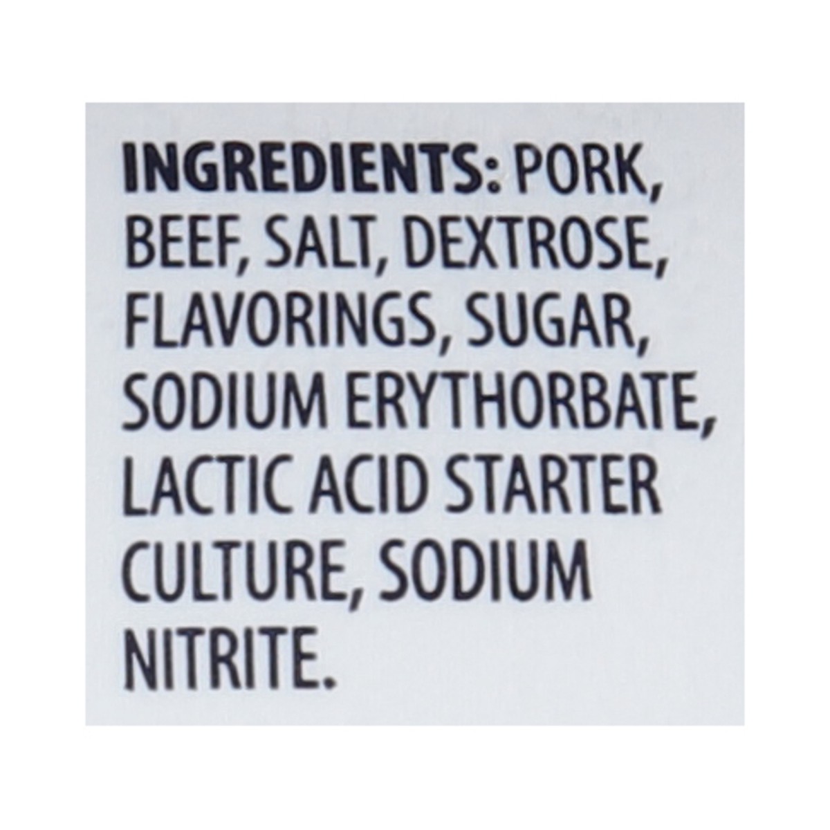 Pork, Beef, Salt, Dextrose, Flavorings, Sugar, Sodium Erythorbate, Lactic Acid Starter Culture, Sodium Nitrite.