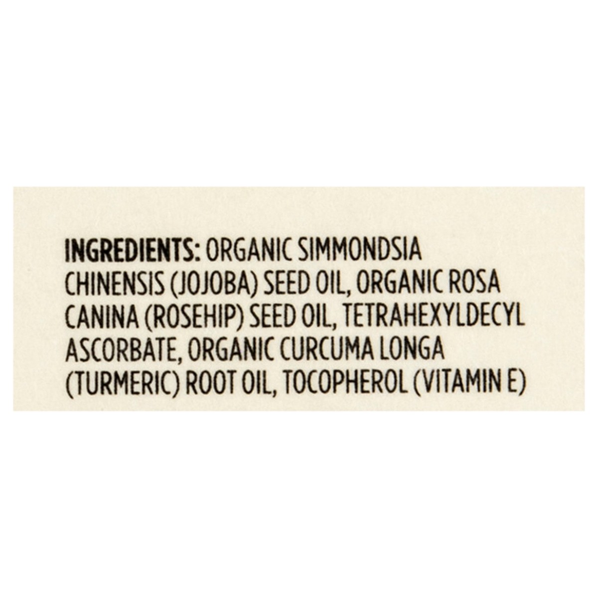 Organic Simmondsia Chinensis (Jojoba) Seed Oil, Organic Rosa Canina (Rosehip) Seed Oil, Tetrahyxyldecyl Ascorbate, Organic Curcuma Longa (Turmeric) Root Oil, Tocopherol (Vitamin E).