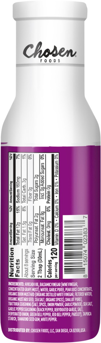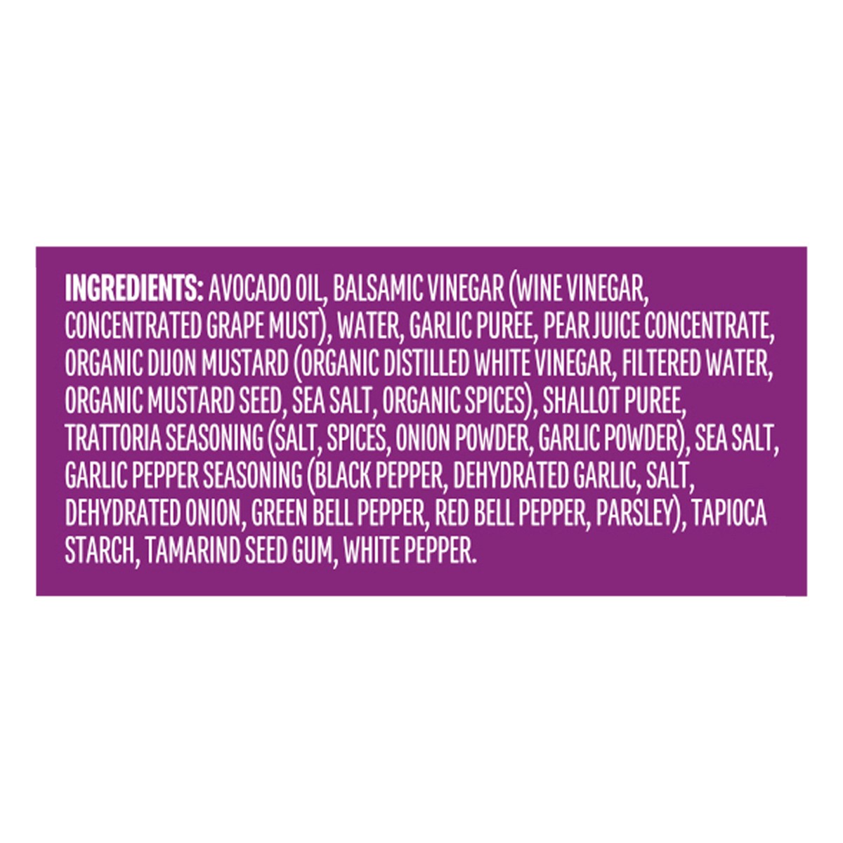 Avocado Oil, Balsamic Vinegar (Wine Vinegar, Concentrated Grape Must), Water, Garlic Puree, Pear Juice Concentrate, Organic Dijon Mustard (Organic Distilled White Vinegar, Filtered Water, Organic Must…