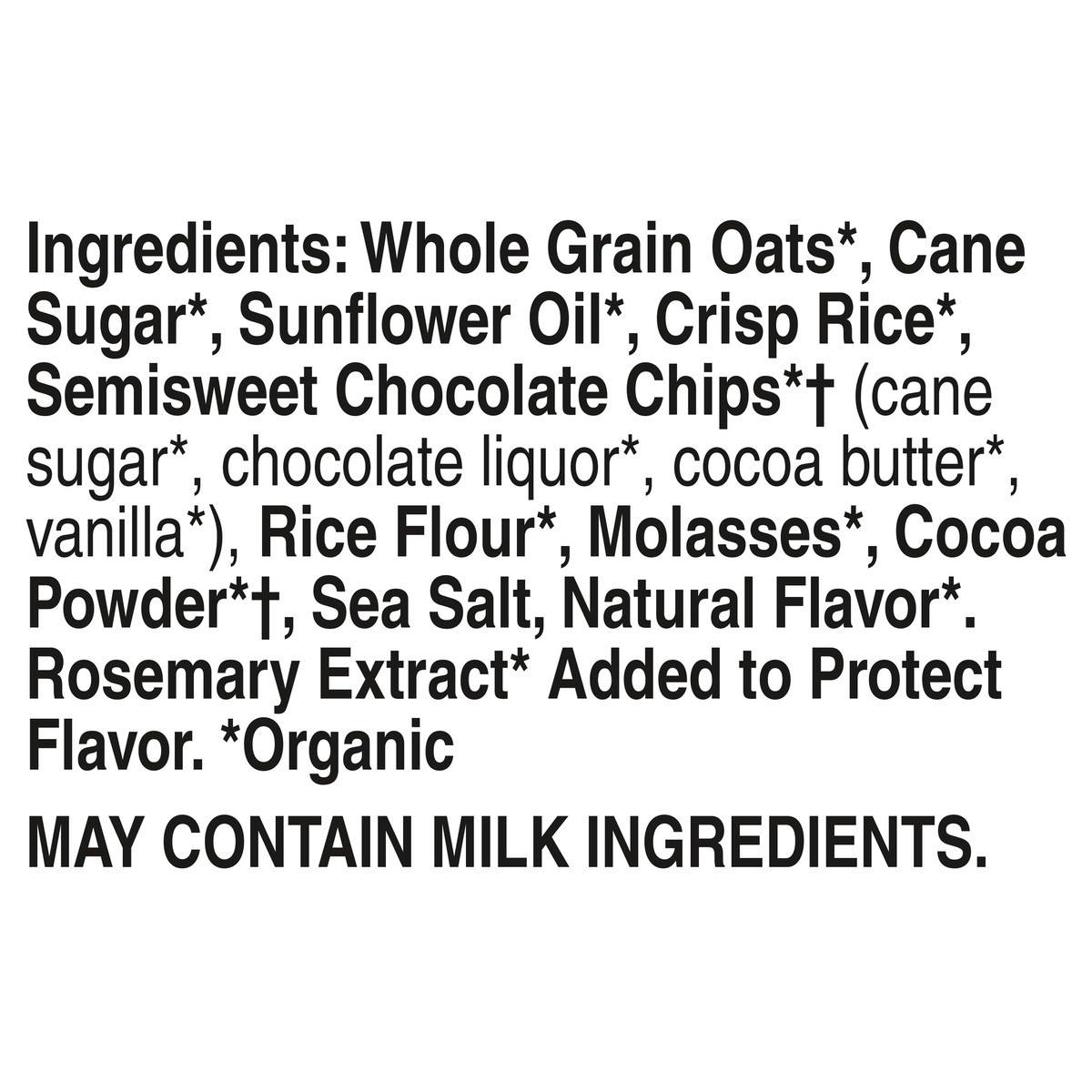 Whole Grain Oats*, Cane Sugar*, Sunflower Oil*, Crisp Rice*, Semisweet Chocolate Chips*(a) (Cane Sugar*, Chocolate Liquor*, Cocoa Butter*, Vanilla*), Rice Flour*, Molasses*, Cocoa Powder*(a), Sea Salt…