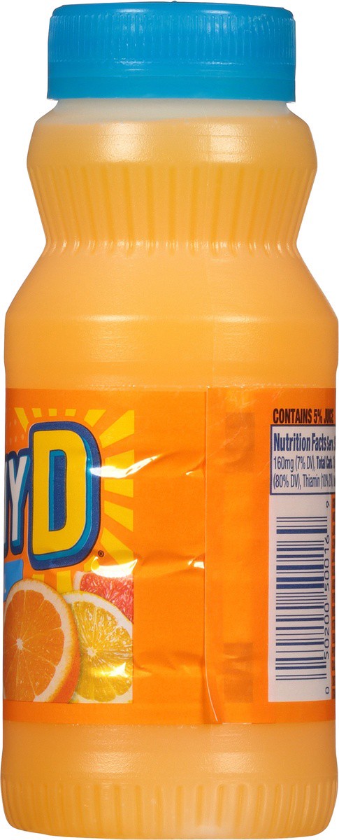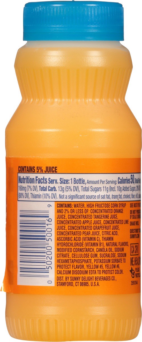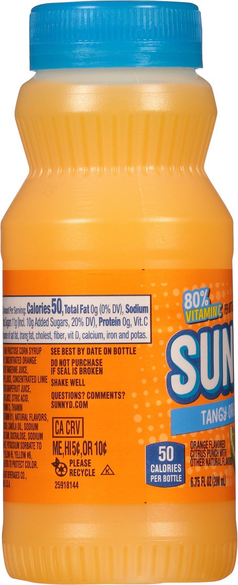 Orange flavored citrus punch with other natural flavors. 50 calorie per bottle. 80% Vitamin C. sunnyd.com. Questions? Comments? sunnyd.com. Please recycle.