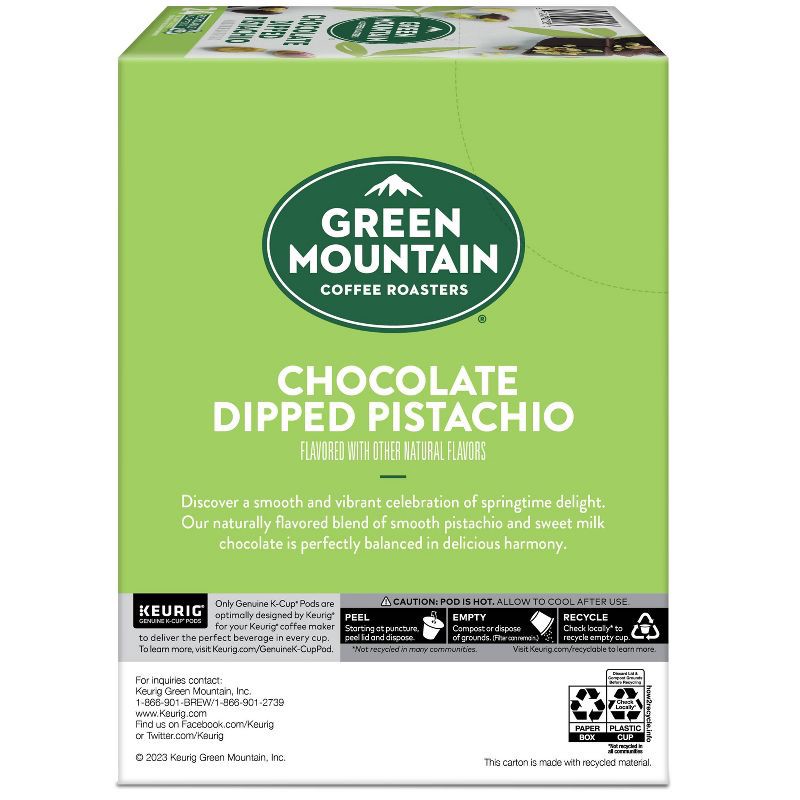 Discover a smooth and vibrant celebration of springtime delight in every sip. Green Mountain Coffee Roasters® Chocolate Dipped Pistachio flavored coffee makes the spring season sing, with its naturall…