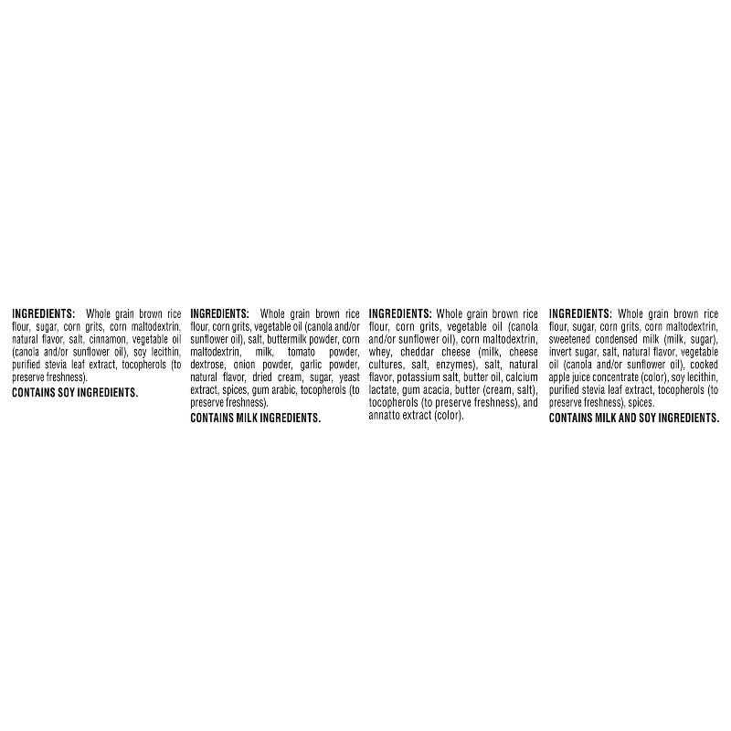 APPLE CINNAMON INGREDIENTS: Whole Grain Brown Rice Flour, Sugar, Corn Grits, Corn Maltodextrin, Natural Flavor, Salt, Cinnamon, Vegetable Oil (Canola And/Or Sunflower Oil), Soy Lecithin, Purified Stev…