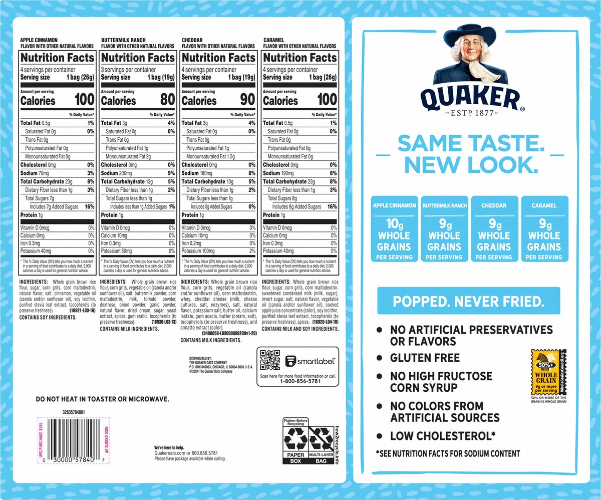 Quaker Rice Snacks now come gluten free*, with a crispy, crunchy texture and tangy apple, zesty cinnamon and many more flavors. Each 30-gram serving contains 120 calories. Each Rice Snack contains 11 …
