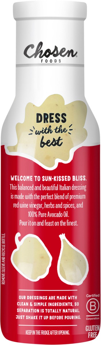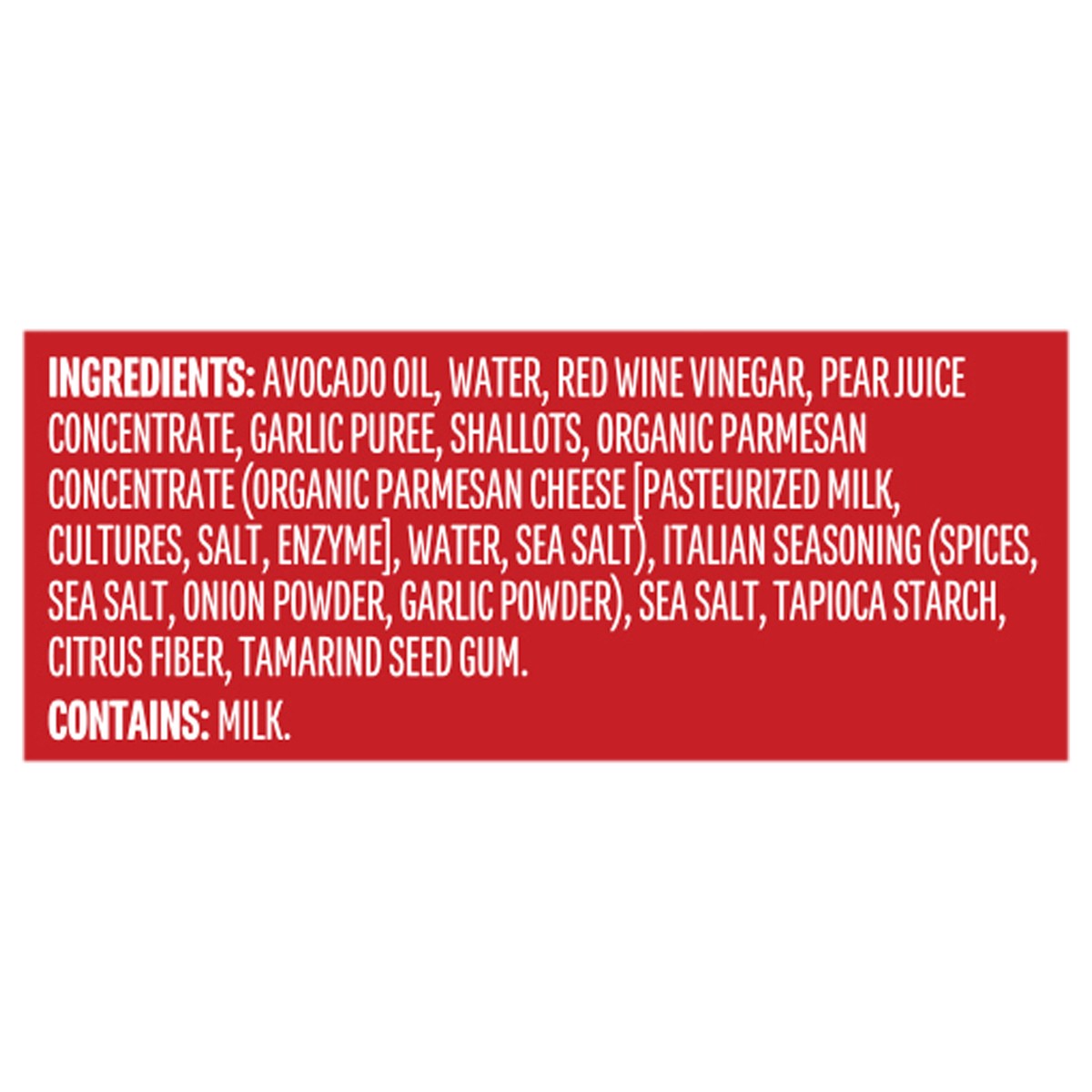 Avocado Oil, Water, Red Wine Vinegar, Pear Juice Concentrate, Garlic Puree, Shallots, Organic Parmesan Concentrate (Organic Parmesan Cheese [Pasteurized Milk, Cultures, Salt, Enzyme], Water, Sea Salt)…