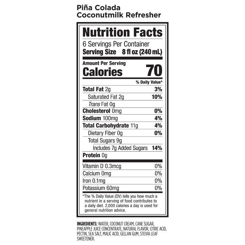 - PLANT-BASED INGREDIENTS: Crafted with simple, plant-based ingredients, Piña Colada Refresher blends real pineapple juice with coconut cream for a smooth and refreshing delight. It's dairy-free, soy-free, and gluten-free, with just the right amount of sweetness.