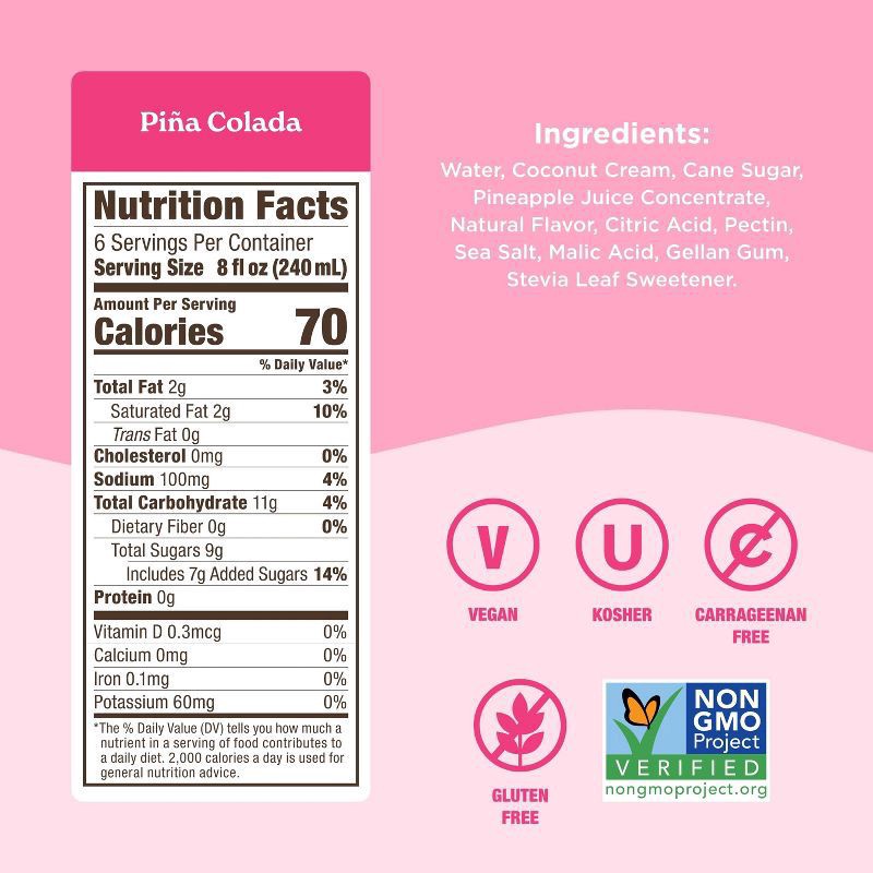 Water, Coconut Cream, Cane Sugar, Pineapple Juice Concentrate, Natural Flavor, Citric Acid, Pectin, Sea Salt, Malic Acid, Gellan Gum, Stevia Leaf Sweetener.