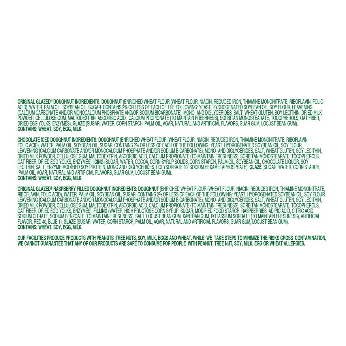 Original Glazed: Doughnut (Enriched Wheat Flour (Wheat Flour, Niacin, Reduced Iron, Thiamine Mononitrate, Riboflavin, Folic Acid), Water, Palm Oil, Soybean Oil, Sugar, Contains 2% or Less of Each of t…