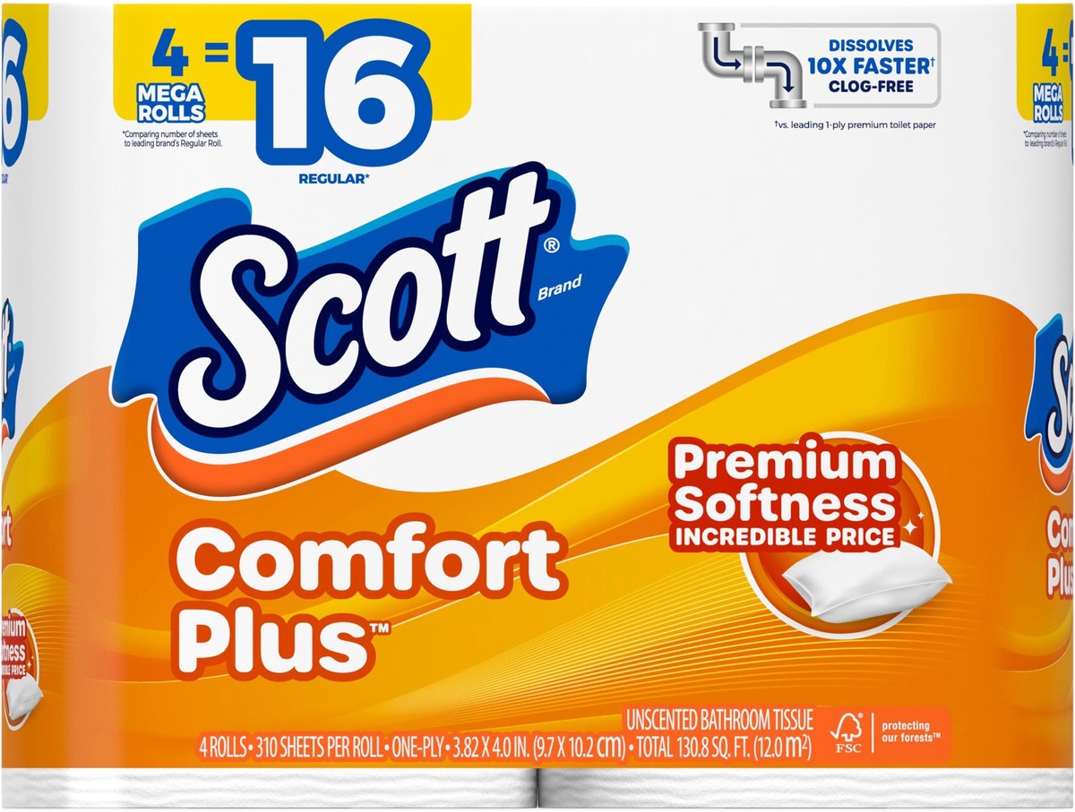 - WHAT’S INCLUDED — 4 Mega Rolls of Scott ComfortPlus Toilet Paper