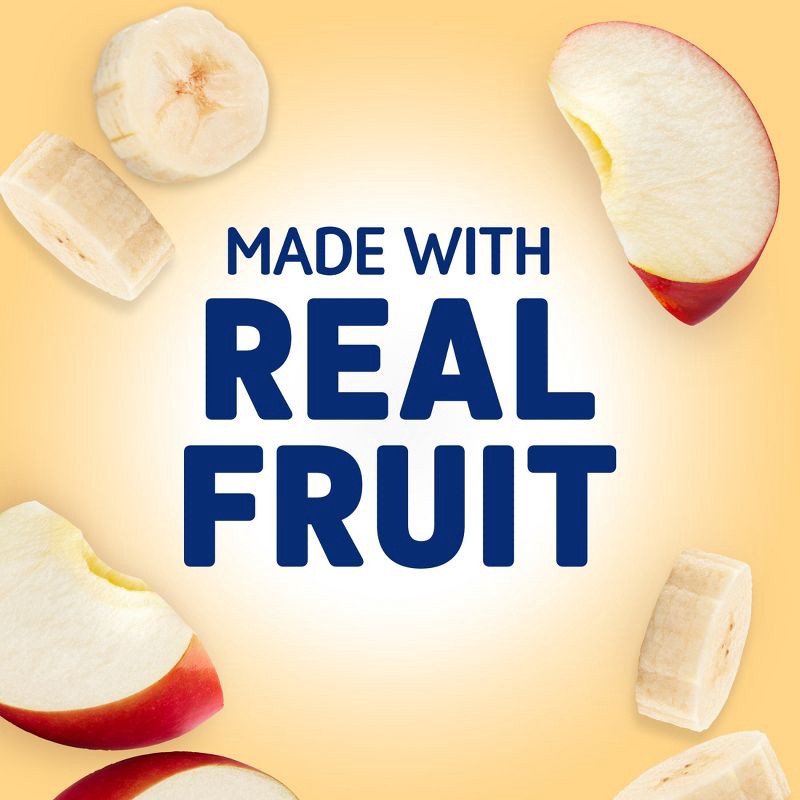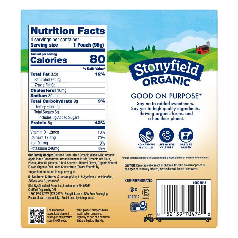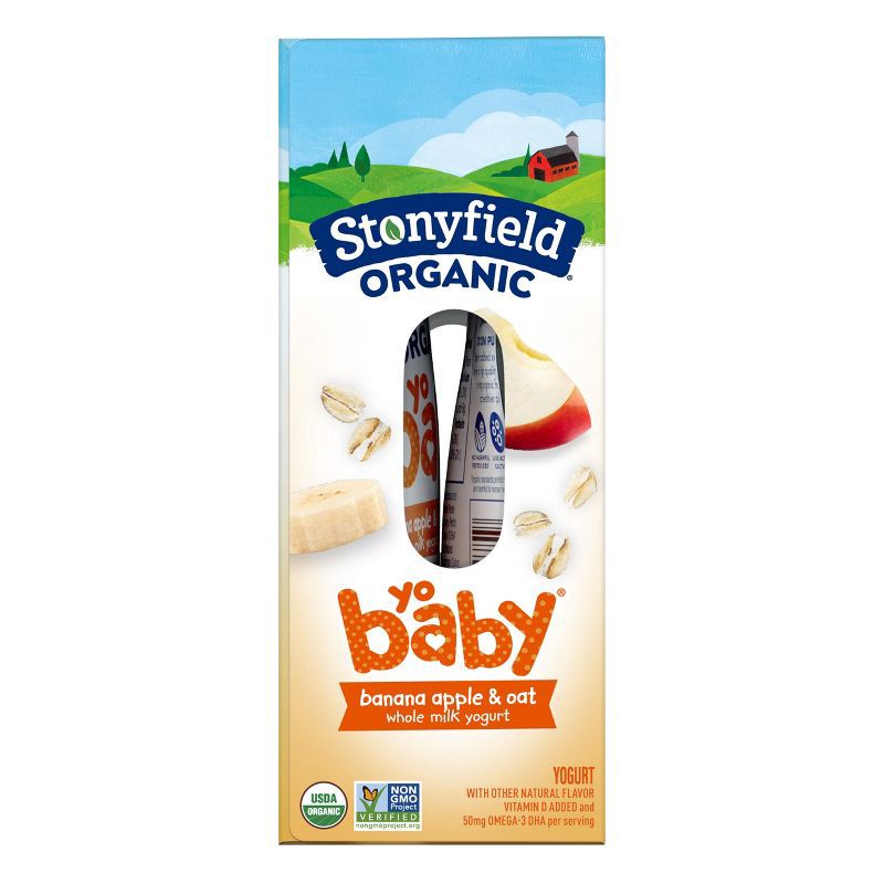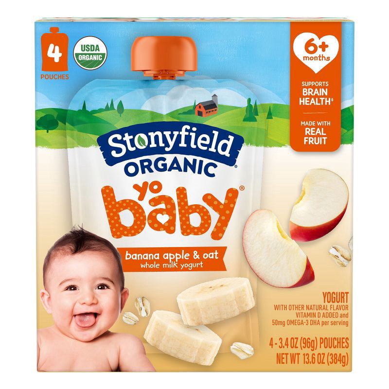 - Four 3.4 oz pouches of Stonyfield Organic YoBaby No Added Sweeteners Banana Apple & Oat Whole Milk Baby Yogurt