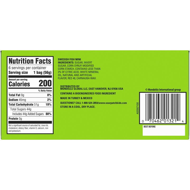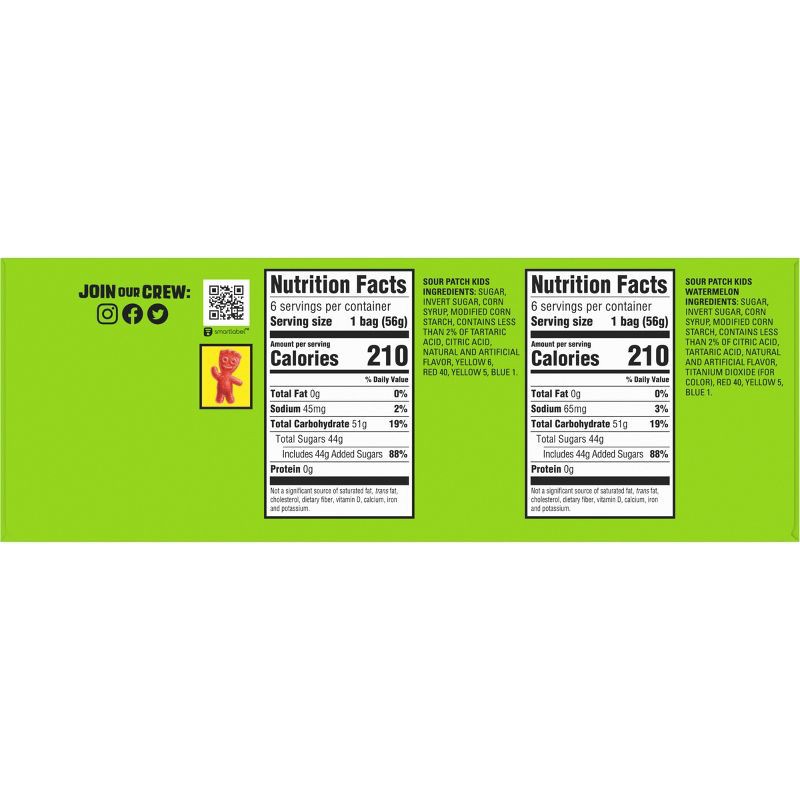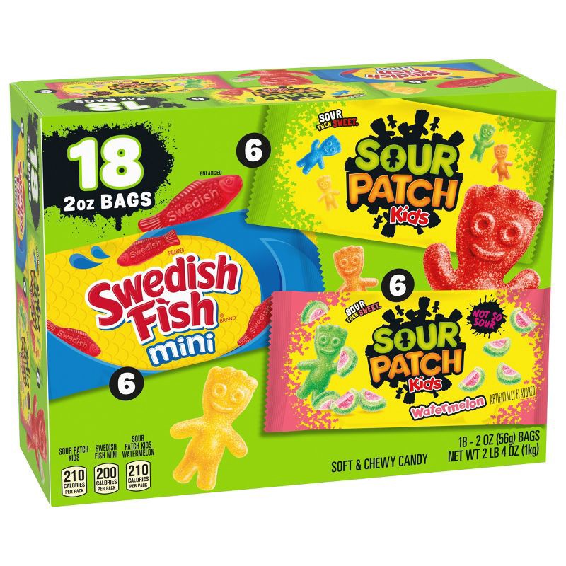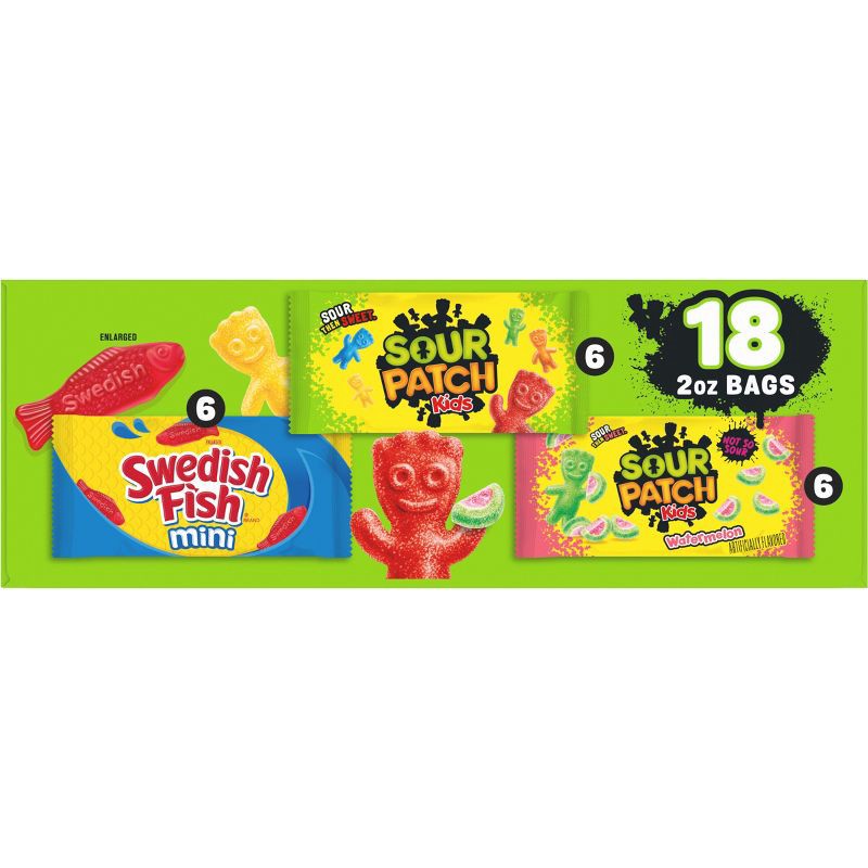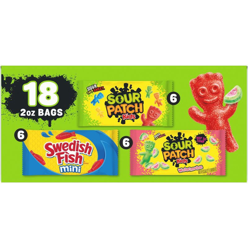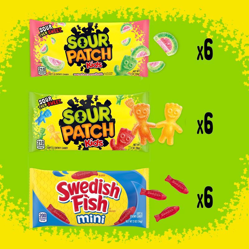 - Includes (6) SOUR PATCH KIDS Original, (6) SOUR PATCH KIDS Watermelon, and (6) SWEDISH FISH Mini bags of candy