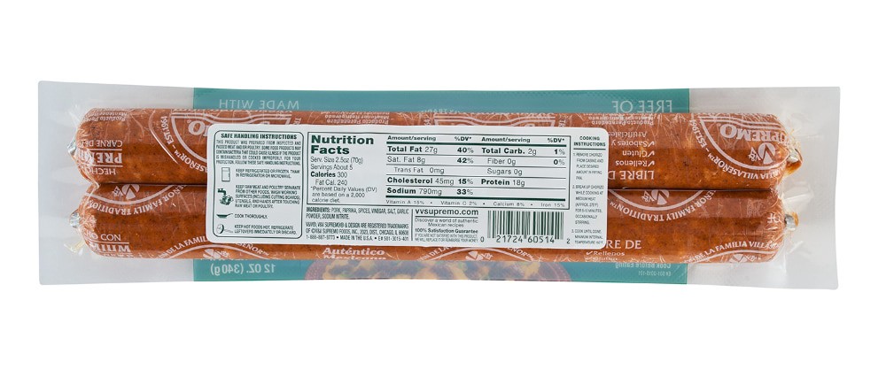 V&V Supremo?s Mexican style spicy pork Chorizo is made with highest quality ingredients, select pork meat, a combination of flavorful spices, the ideal proportion of percent fat, and the traditional s…
