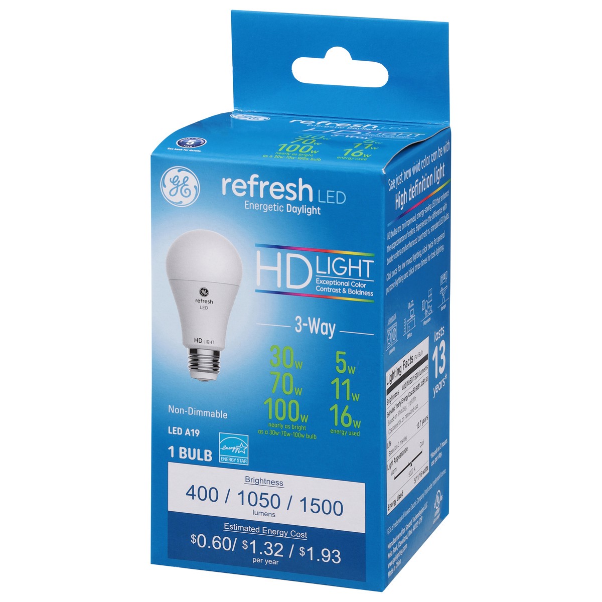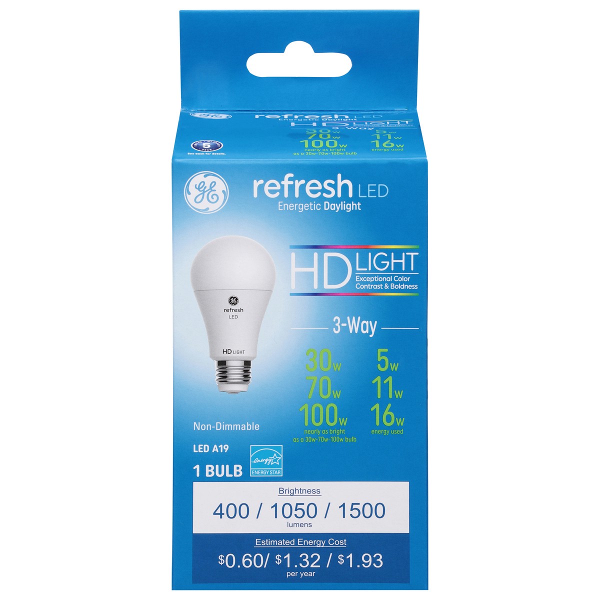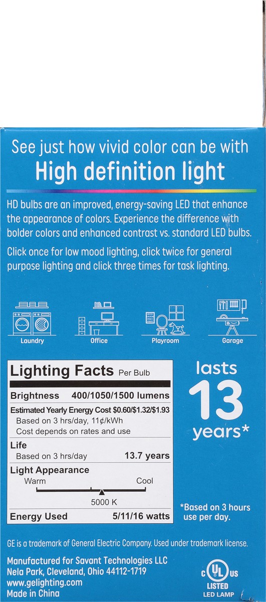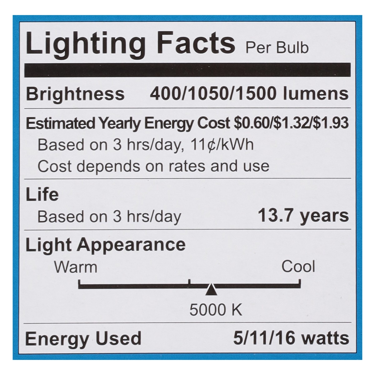 Model Number: A21 Brightness Quantity: 400 lumens; 1050 lumens; 1500 lumens. Energy Info: $0.60; $1.32; $1.93 based on 3 hrs/day, 11¢/kWh. Cost depends on rates and use. 5 watts; 11 watts; 16 watts. P…