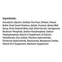Cornstarch, Glycerin, Sorbitol, Pea Flour, Chicken, Peanut Butter, Dried Sweet Potatoes, Gelatin, Fructose, Barley Malt Syrup, Dried Culture Whey, Salt, Dried Carrots, Carrageenan, Dicalcium Phosphate…