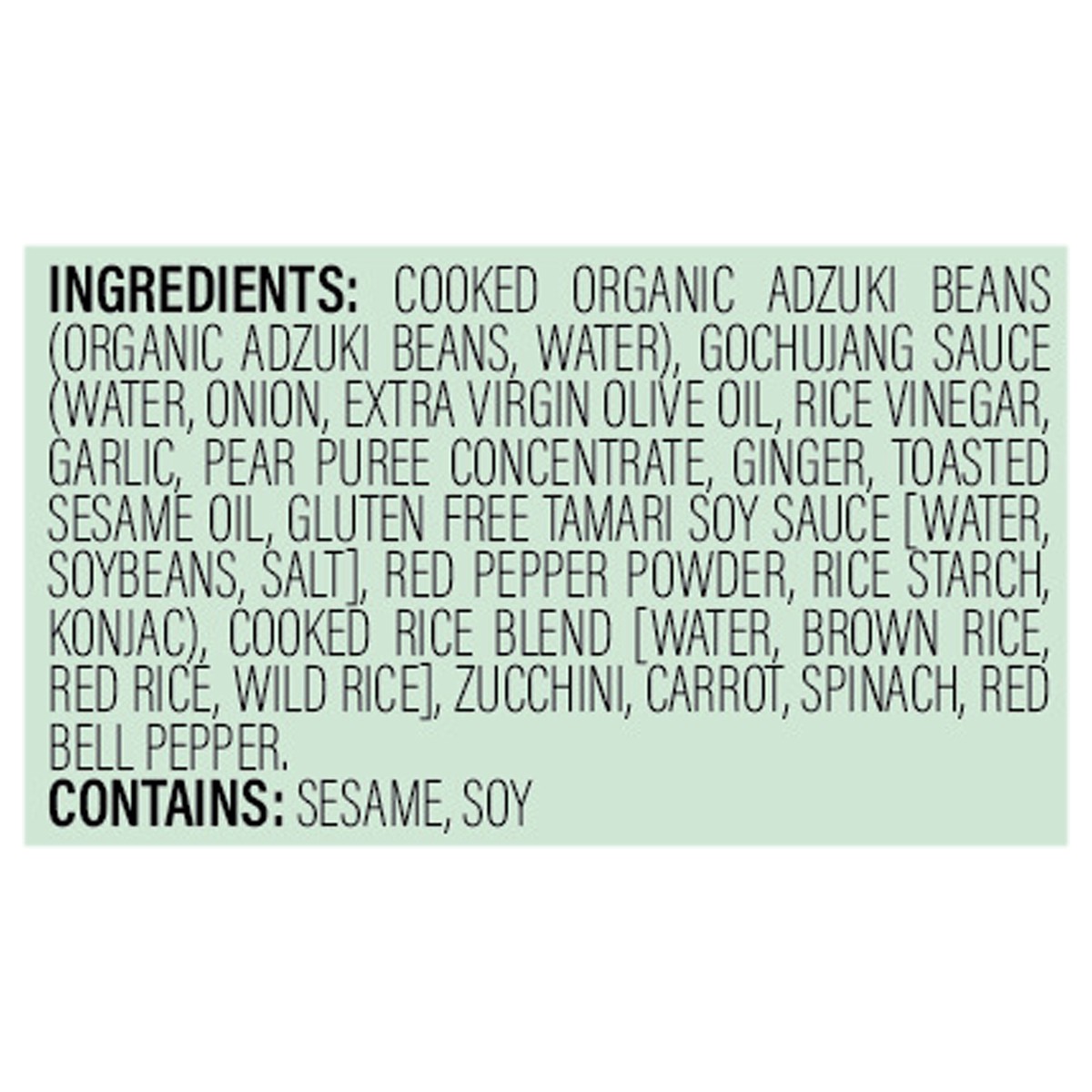 Cooked Organic Adzuki Beans (Organic Adzuki Beans, Water), Gochujang Sauce (Water, Onion, Extra Virgin Olive Oil, Rice Vinegar, Garlic, Pear Puree Concentrate, Ginger, Toasted Sesame Oil, Gluten Free …