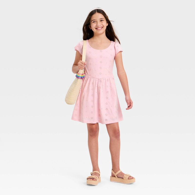 Girls' Short Sleeve Knit Eyelet Dress - Cat & Jack™ Light Pink XL