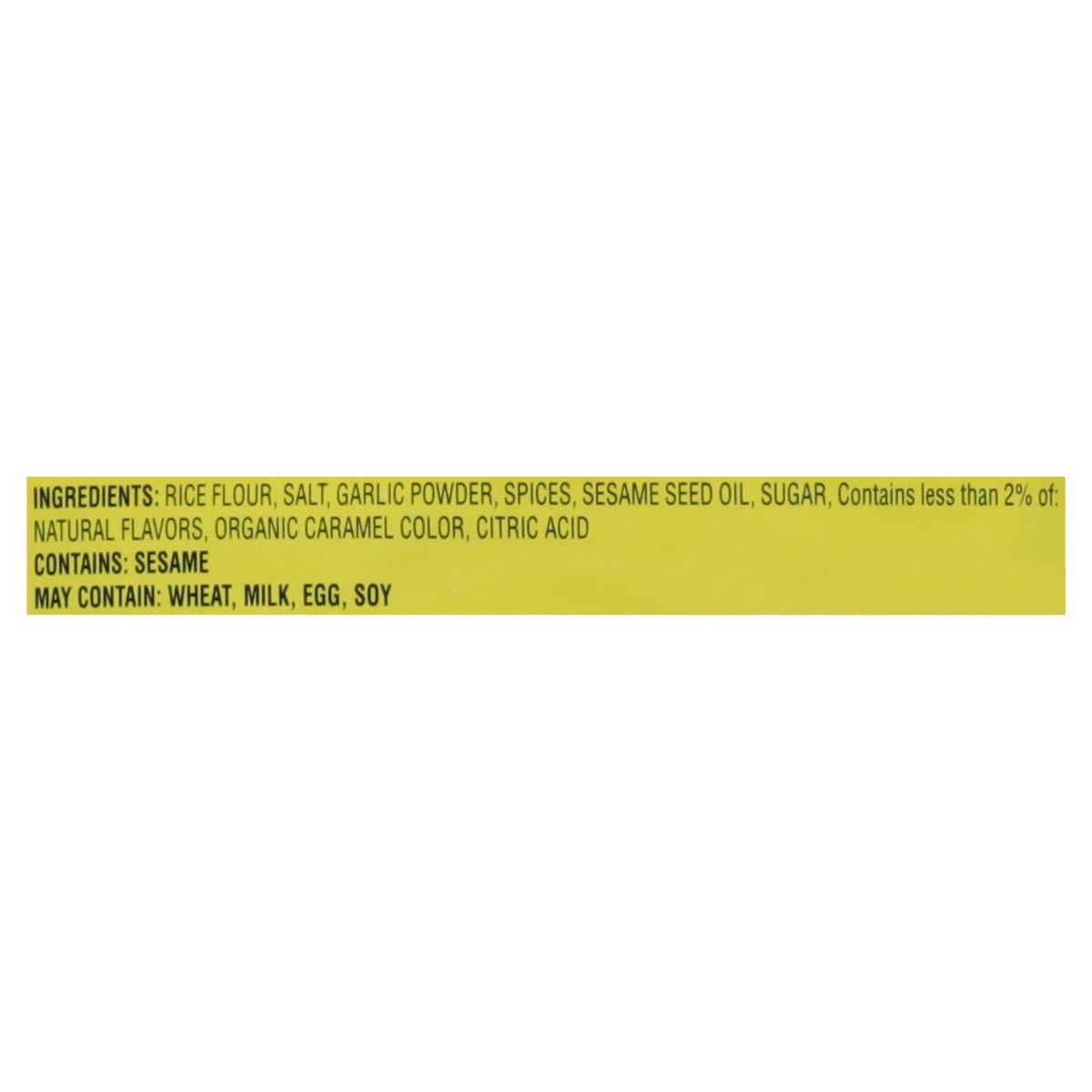 Rice Flour, Salt, Garlic Powder, Spices, Sesame Seed Oil, Sugar, Contains Less than 2% of: Natural Flavors, Organic Caramel Color, Citric Acid.