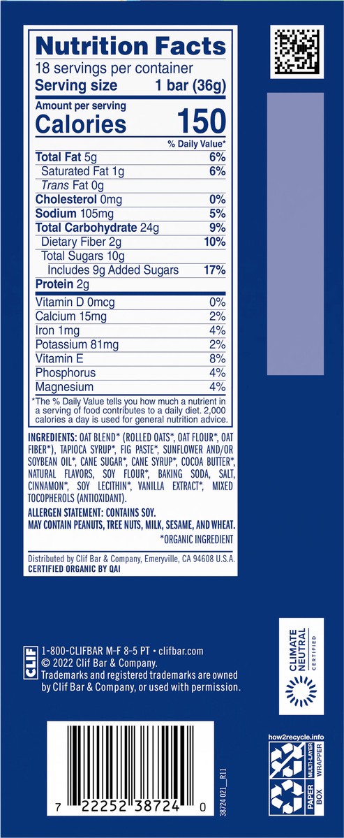 INGREDIENTS: OAT BLEND* (ROLLED OATS*, OAT FLOUR*, OAT FIBER*), TAPIOCA SYRUP*, FIG PASTE*, SUNFLOWER AND/OR SOYBEAN OIL*, CANE SUGAR*, CANE SYRUP*, COCOA BUTTER*, NATURAL FLAVORS, SOY FLOUR*, BAKING …