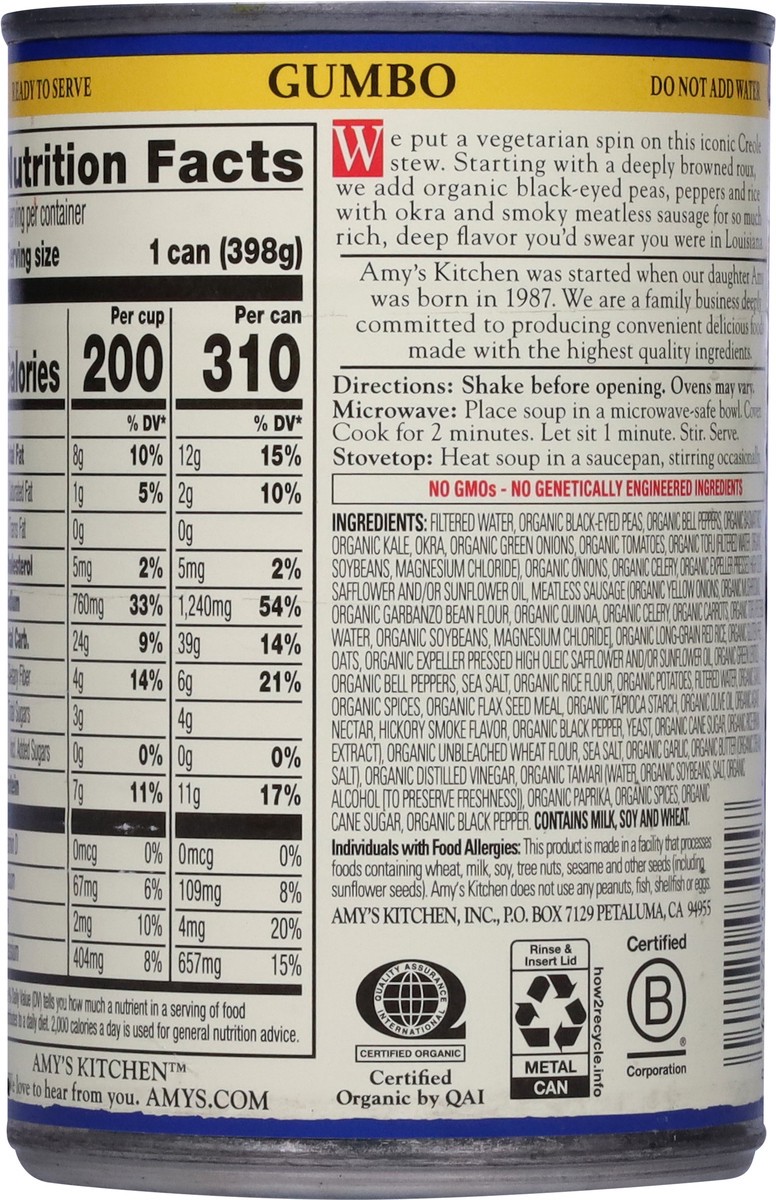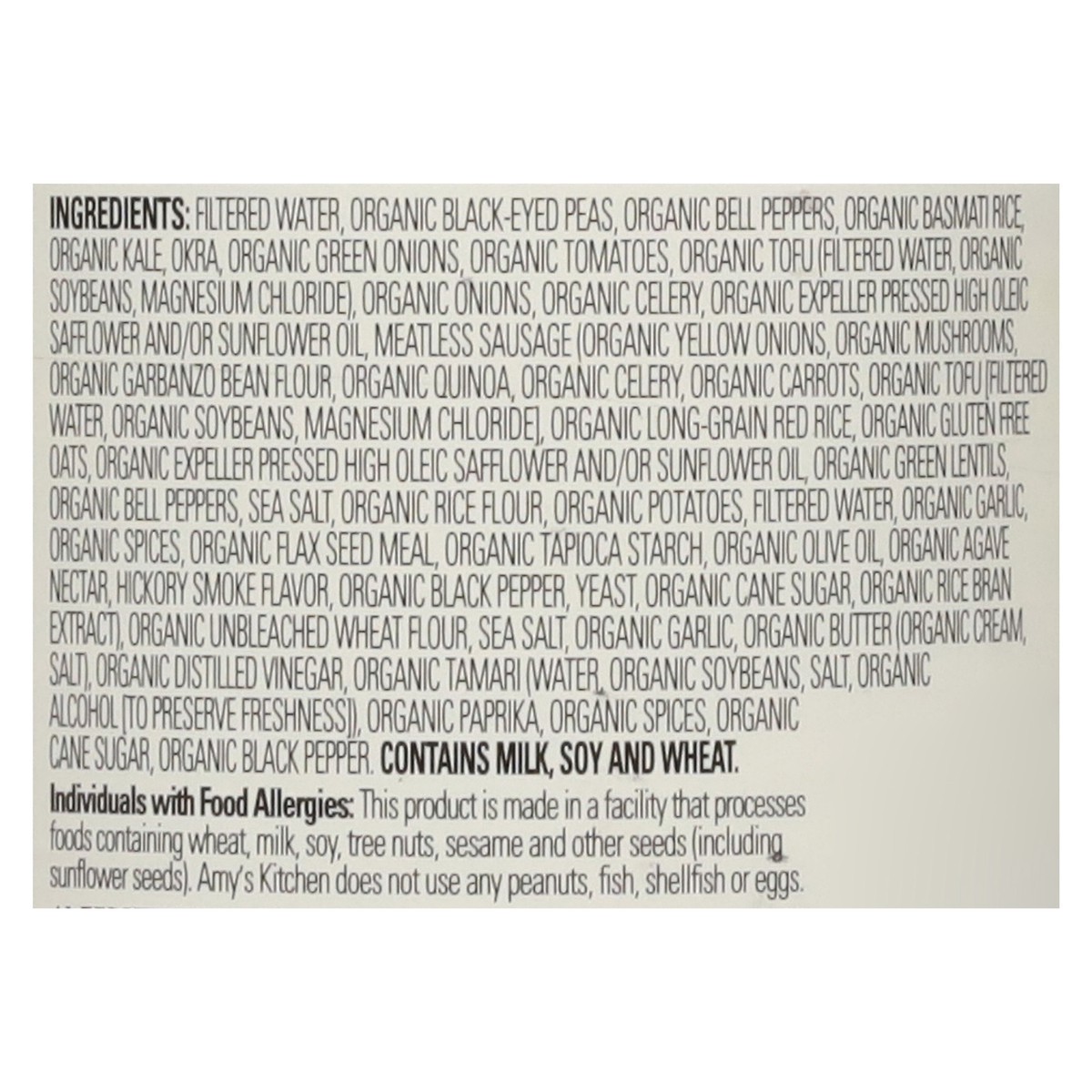 Filtered Water, Organic Black-Eyed Peas, Organic Bell Peppers, Organic Basmati Rice, Organic Kale, Okra, Organic Green Onions, Organic Tomatoes, Organic Tofu (Filtered Water, Organic Soybeans, Magnesi…