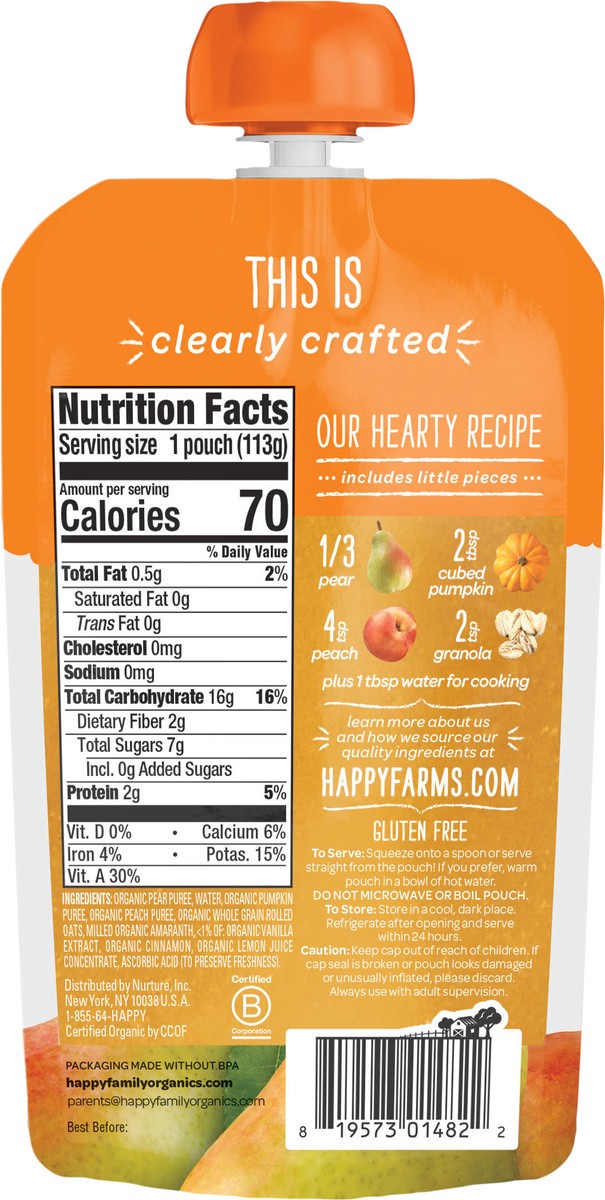 Organic Pear Puree, Water, Organic Pumpkin Puree, Organic Peach Puree, Milled Organic Whole Grain Oats, Milled Organic Amaranth, <1% of: Organic Vanilla Extract, Organic Cinnamon, Organic Lemon Juice …