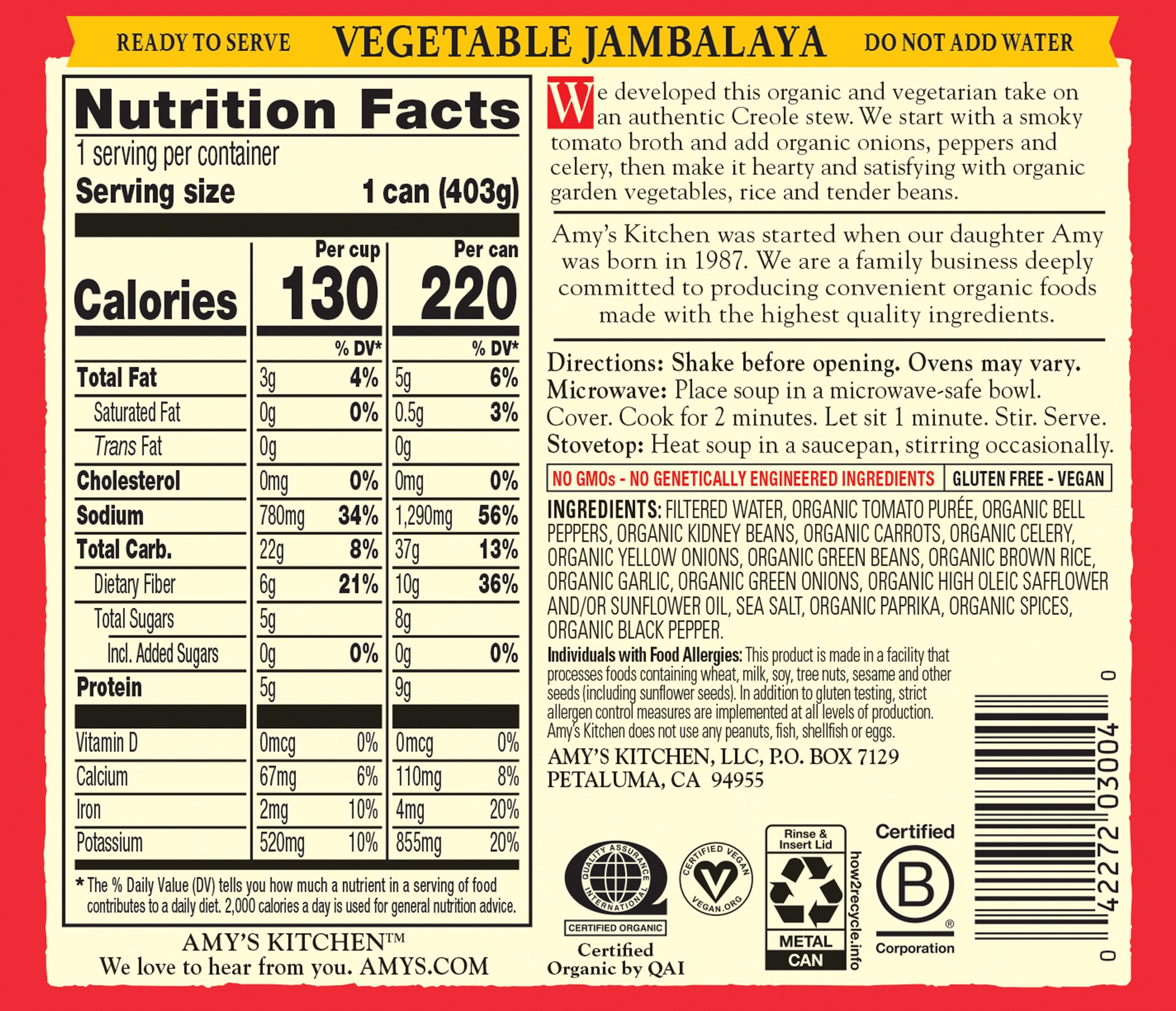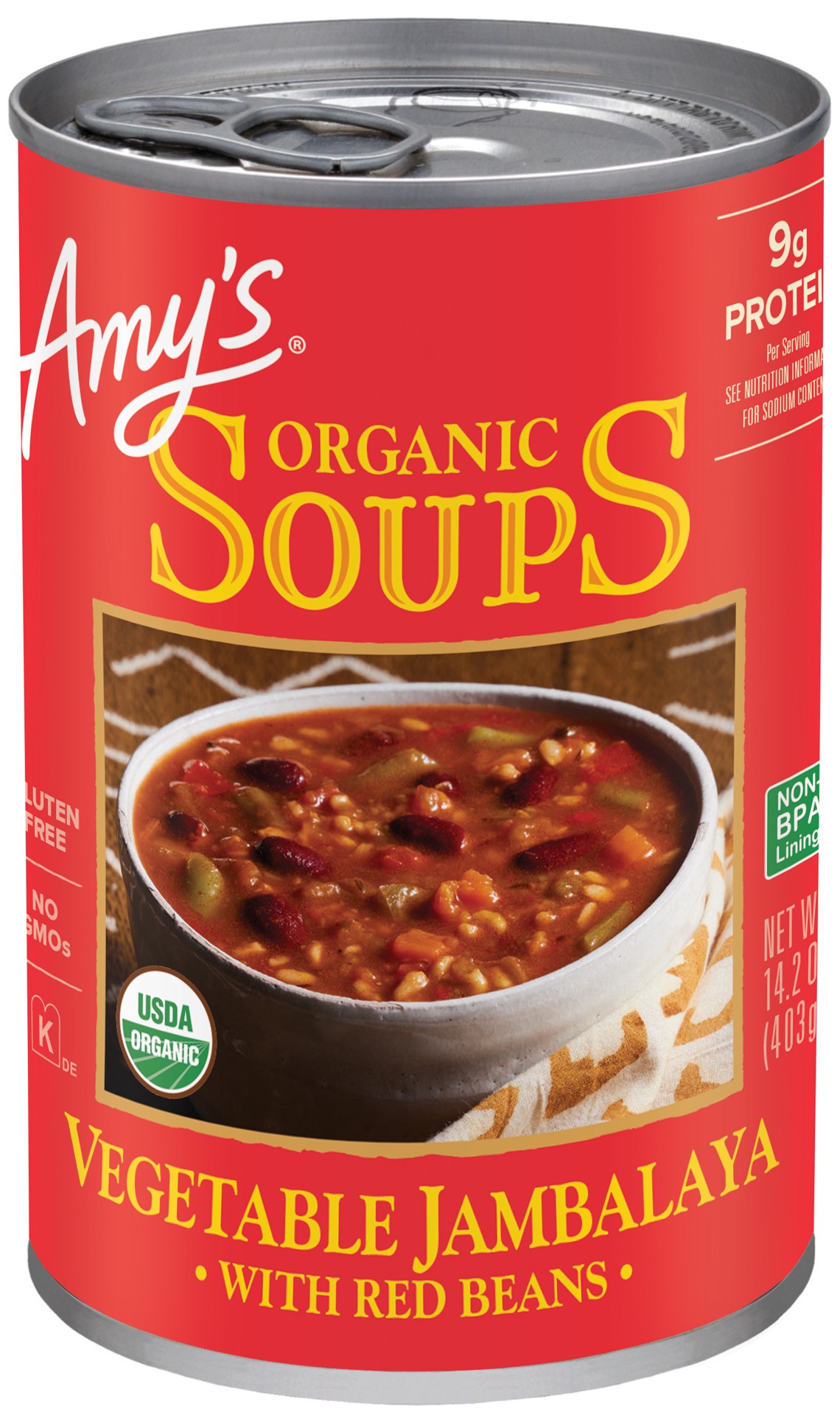 Amy's Organic Vegetable Jambalaya is made from organic red beans, rice and vegetables simmered in a thick, smoky tomato broth. Our vegetable soup Jambalaya is made with high-quality, organic ingredien…