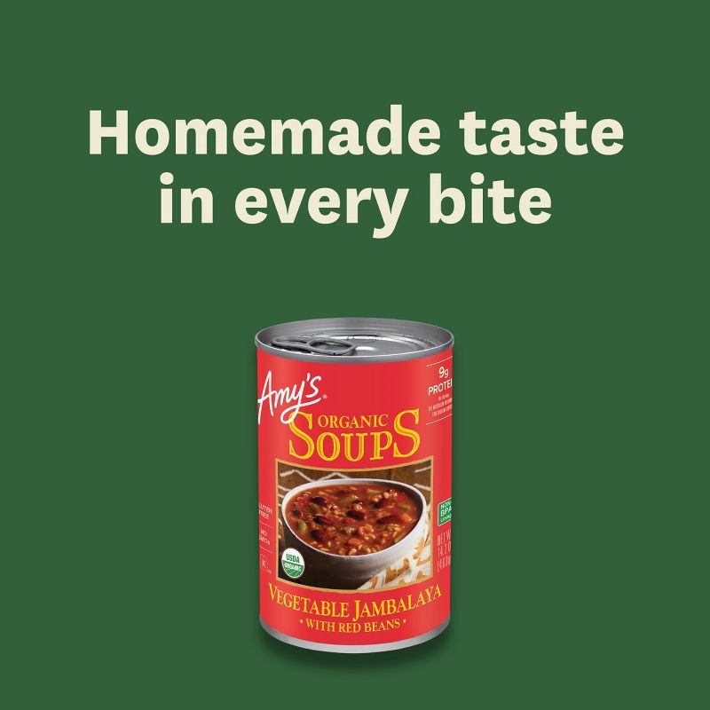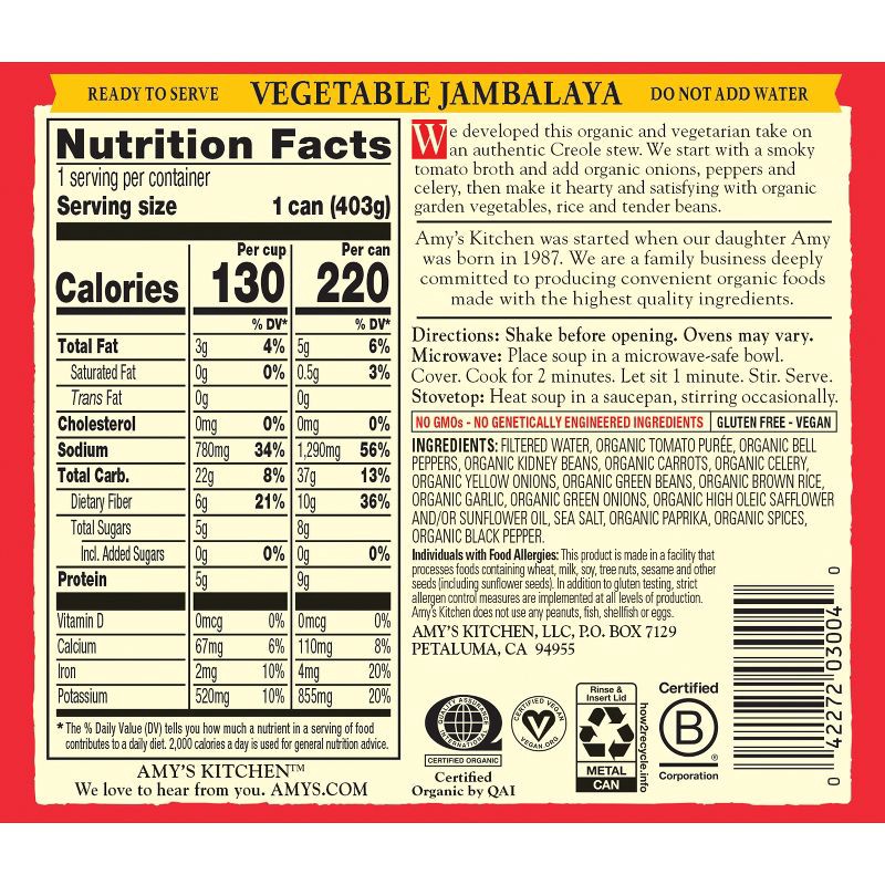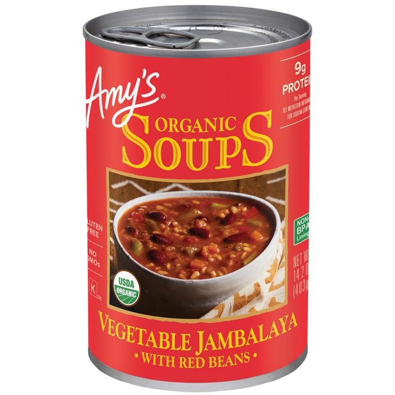 - Amy's Organic Vegetable Jambalaya is made with organic red beans, rice and vegetables simmered in a thick, smoky tomato broth
