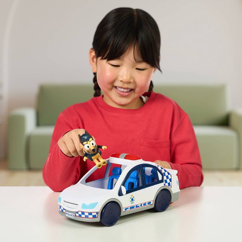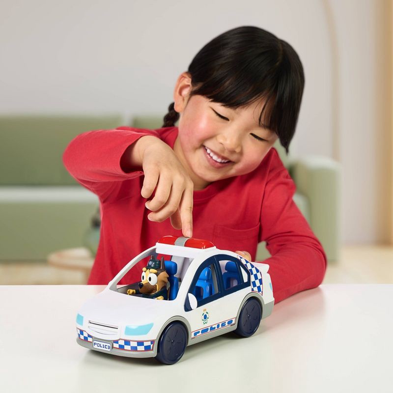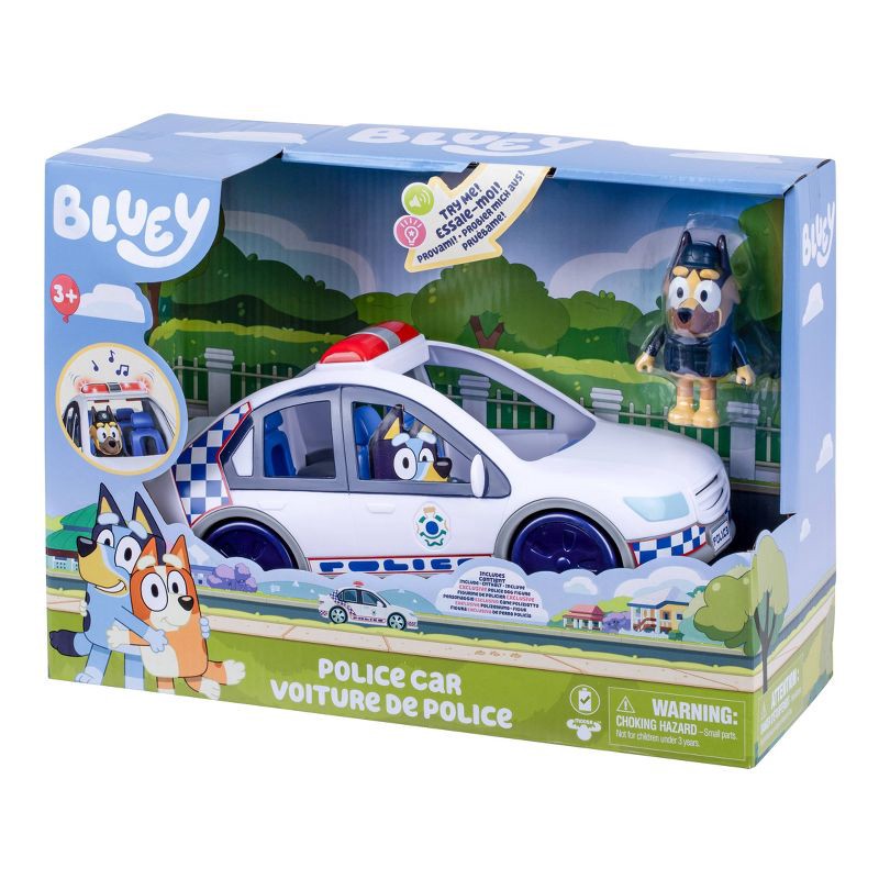 - The Bluey Police Car includes a police car with lights & sounds, Policeman figure, and a themed sticker set.