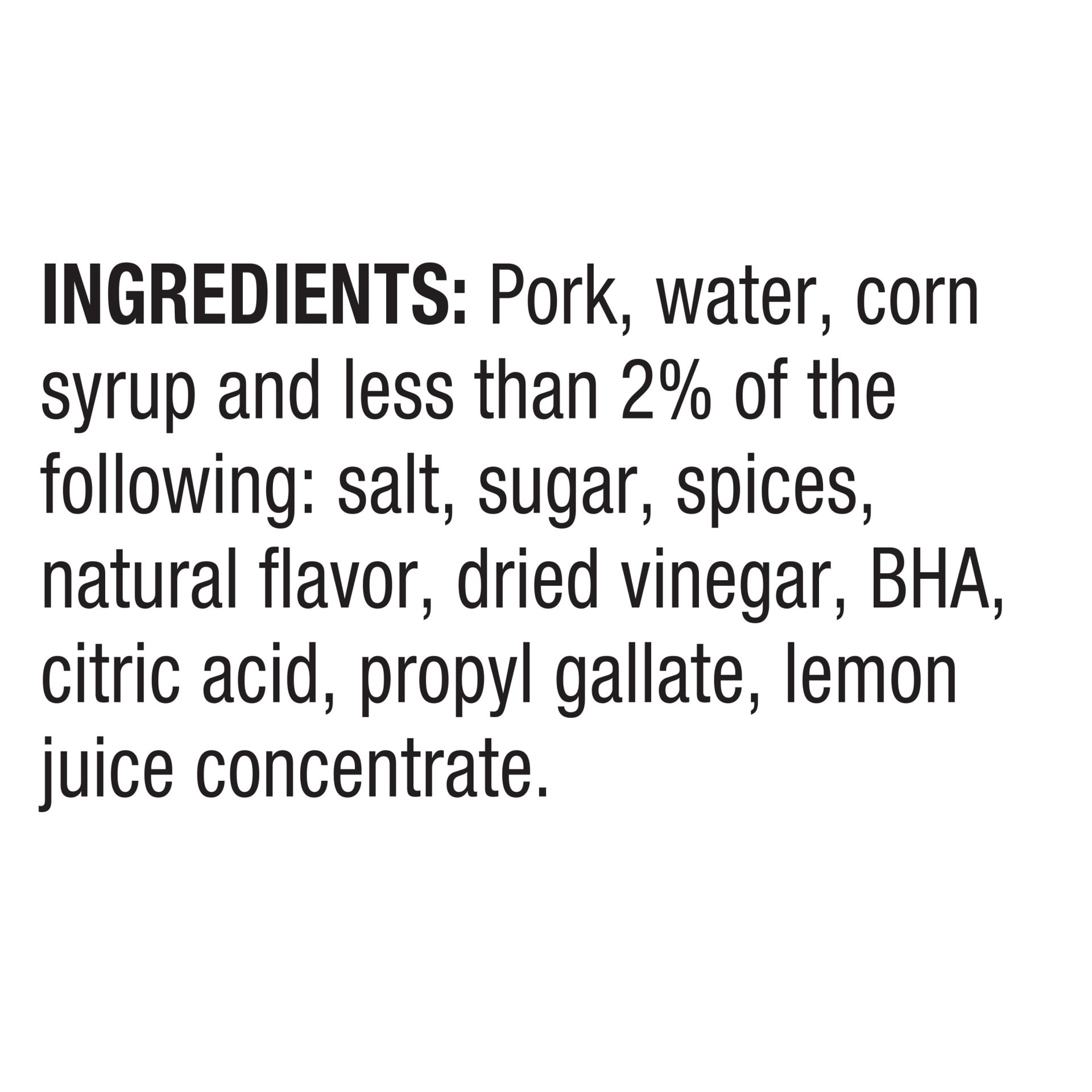 Ingredients: Pork, water, corn syrup and less than 2% of the following: salt, sugar, spices, natural flavor, dried vinegar, BHA, citric acid, propyl gallate, lemon juice concentrate.