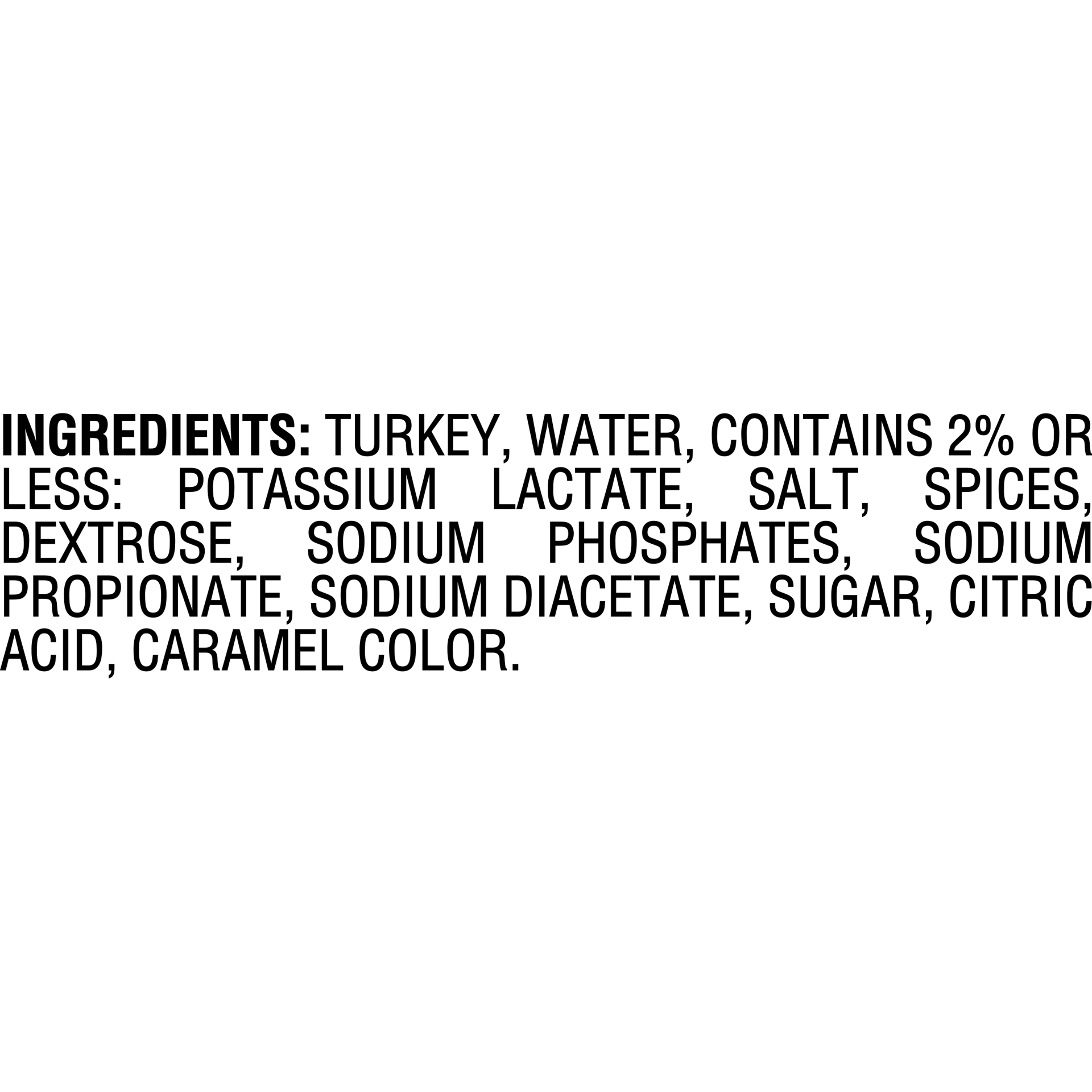 Turkey, Water, Contains 2% Or Less: Potassium Lactate, Salt, Spices, Dextrose, Sodium Phosphates, Sodium Propionate, Sodium Diacetate, Sugar, Citric Acid, Caramel Color.