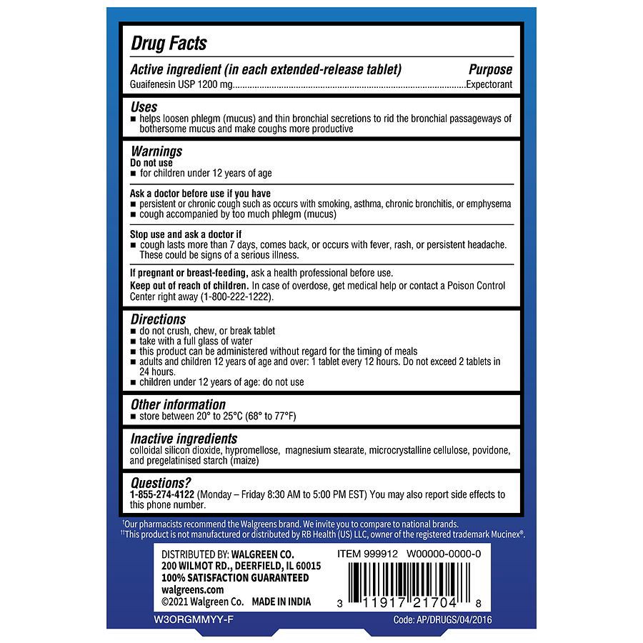 Relieves chest congestion Thins & loosens mucus Extended-release tablets Compare to the active ingredient in Mucinex Maximum Strength. Walgreens pharmacist recommended.* *Our pharmacists recommend theā¦