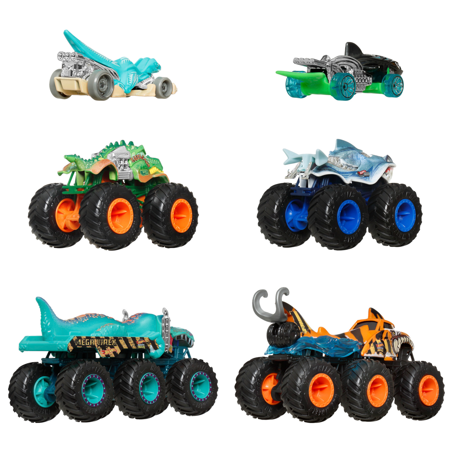 Recreate favorite moments from the Hot Wheels Monster Trucks Sharks vs. Dinos YouTube Kids series with a multipack that includes six different-sized vehicles! Go full Sharks vs. Dinos with Tiger Shark…