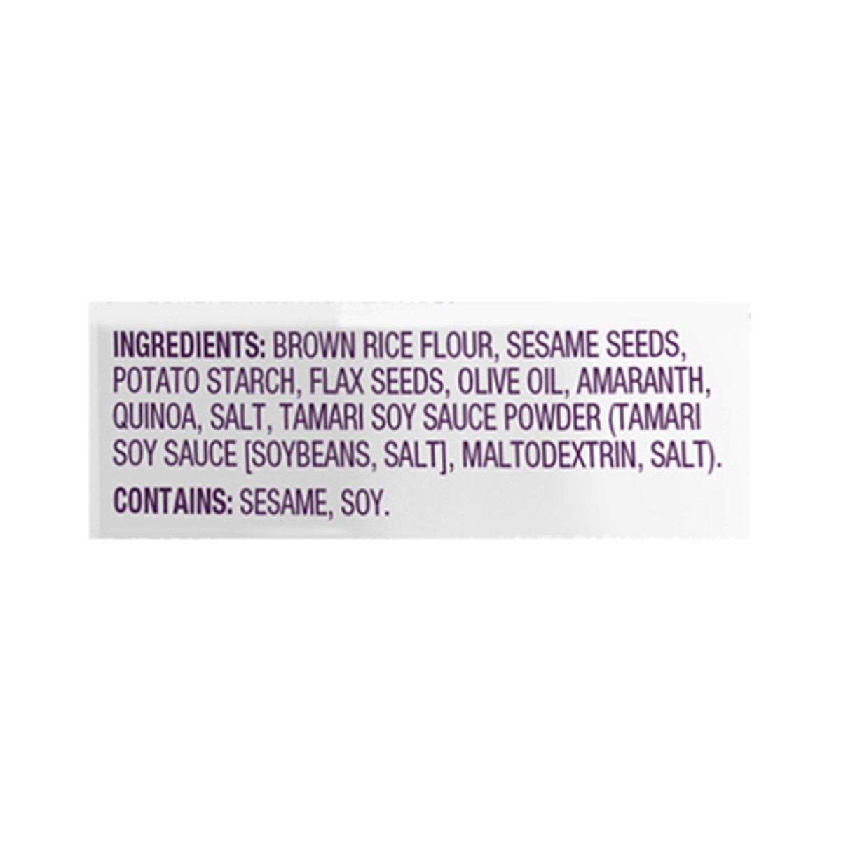 Brown Rice Flour, Sesame Seeds, Potato Starch, Flax Seeds, Olive Oil, Amaranth, Quinoa, Salt, Tamari Soy Sauce Powder (Tamari Soy Sauce [Soybeans, Salt], Maltodextrin, Salt).