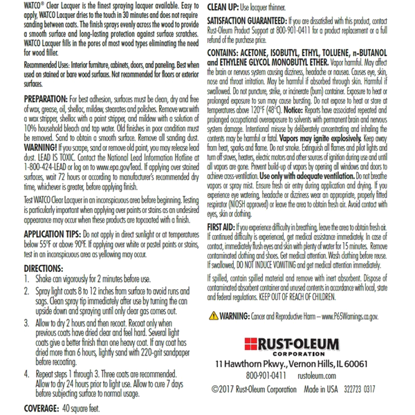 Watco Crystal Clear Lacquer Wood Finish Spray quickly adds a durable final layer of protection to wood projects such as furniture, cabinets, doors, trim and more. Fast-drying formula sprays on easily …