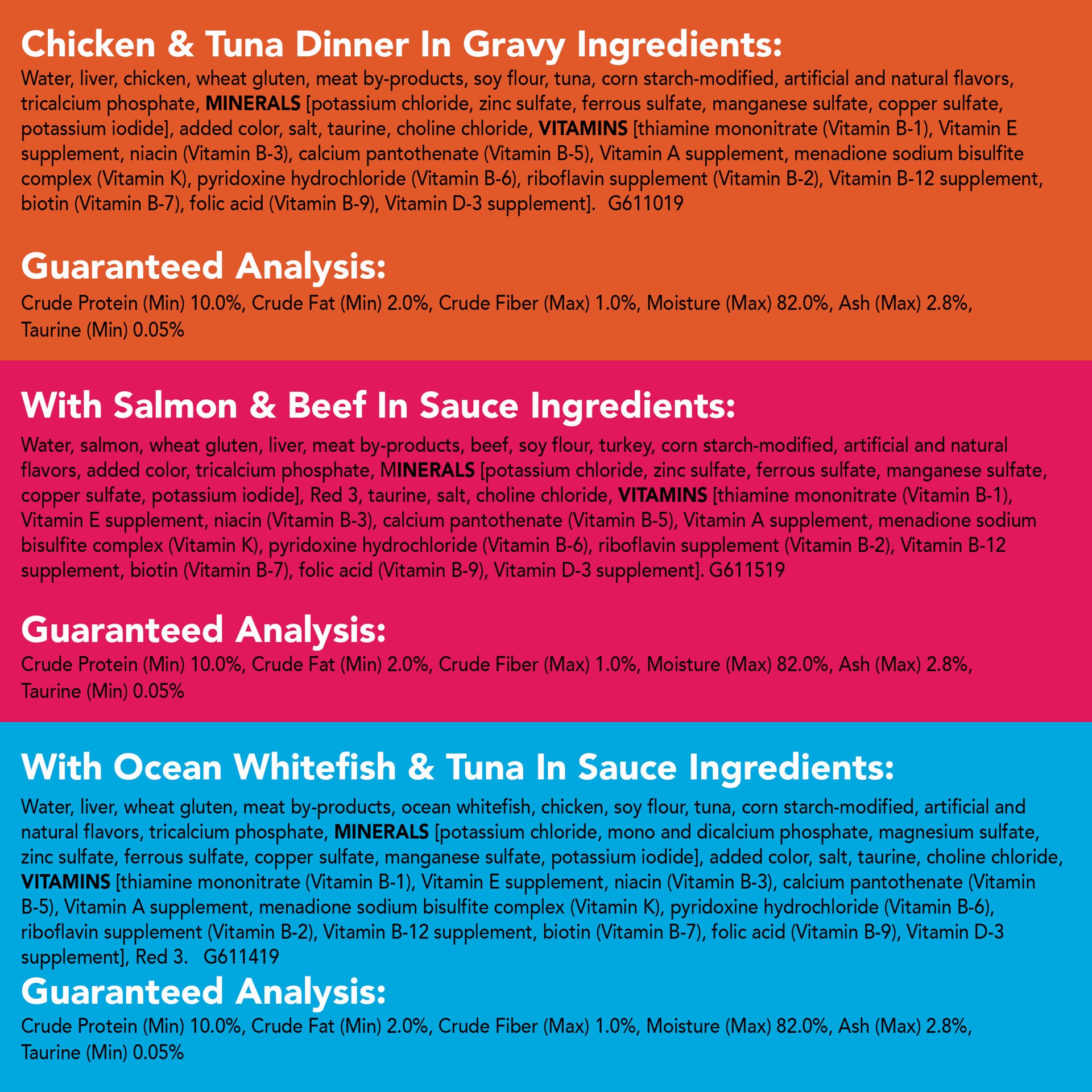 Chicken & Tuna Dinner In Gravy: Water, Chicken, Liver, Wheat Gluten, Meat By-Products, Soy Flour, Tuna, Corn Starch-Modified, Artificial and Natural Flavors, Tricalcium Phosphate, Minerals [Potassium …