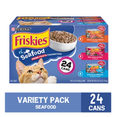 Let your cat's taste buds set sail with the flavors found in this Purina Friskies Prime Filets Seafood Favorites variety pack wet cat food. Four different recipes bring yummy fish flavors, along with …