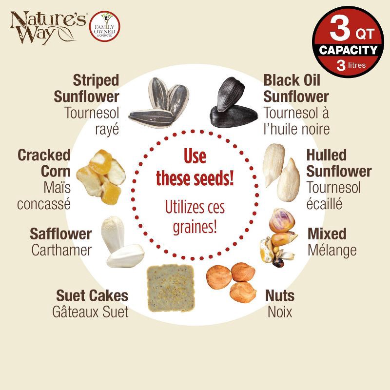 - ATTRACTIVE DESIGN: Hopper-style feeder holds up to 3 quarts of sunflower or mixed seed with two side suet cages to attract a wide variety of backyard birds.