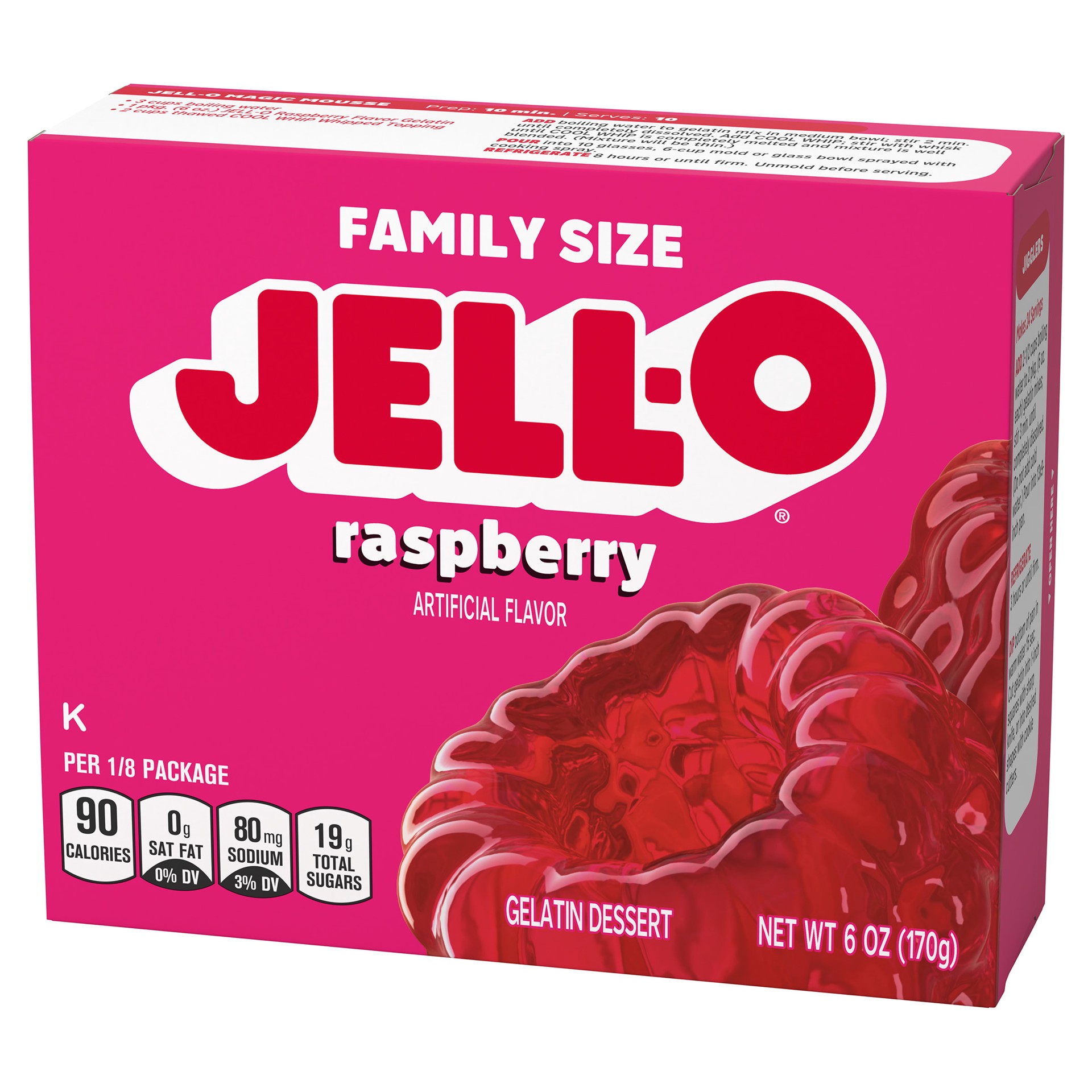 Snack happy. Jell-O Raspberry Artificially Flavored Gelatin Dessert Mix lets you add some wonder to your day with a delicious snack. Spoon up a smile with our artificially flavored raspberry Jell-O ge…