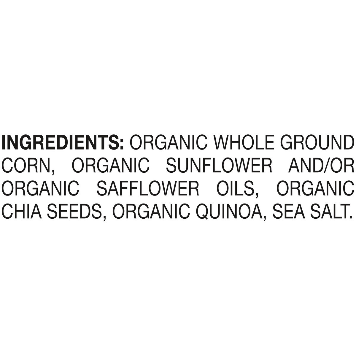 INGREDIENTS: ORGANIC WHOLE GROUND CORN, ORGANIC SUNFLOWER AND/OR ORGANIC SAFFLOWER OILS, ORGANIC CHIA SEEDS, ORGANIC QUINOA, SEA SALT.