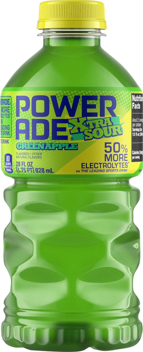 - Make your summer SOUR with POWERADE XTRA SOUR Sports DrinksPOWERADE XTRA SOUR Green Apple helps hydrate you with the bold and vibrant flavor of tart green applePOWERADE electrolyte drinks contain 50% more electrolytes versus the leading sports drink [Per 12 fl oz: POWERADE - 240mg (Sodium)