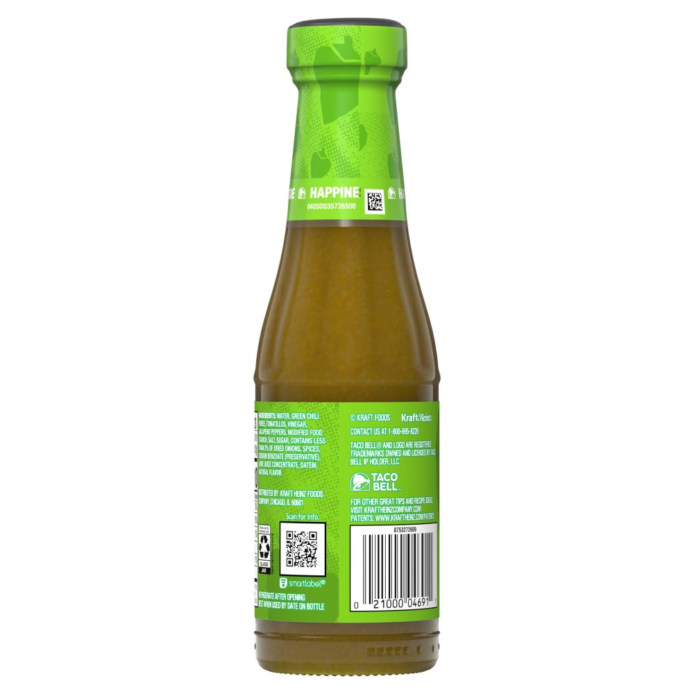 Live más at home with our Taco Bell Verde Salsa. Taco Bell makes mealtime more craveable with classic salsa verde flavor that gives a tangy, spicy kick to your meals. Our sauce has the perfect consist…